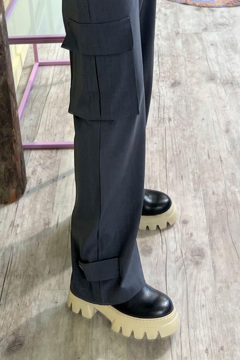 Mørkegrå bukser kan man altid bruge. Disse fra mbyM er et godt bud til garderoben. Bukserne har elastik bagpå i taljen, så den slutter fint til uden at gabe når man sætter ned. Der er en knap effekt i bunden, så giver mulighed for at bruge dem med til forskellige vider i benene.