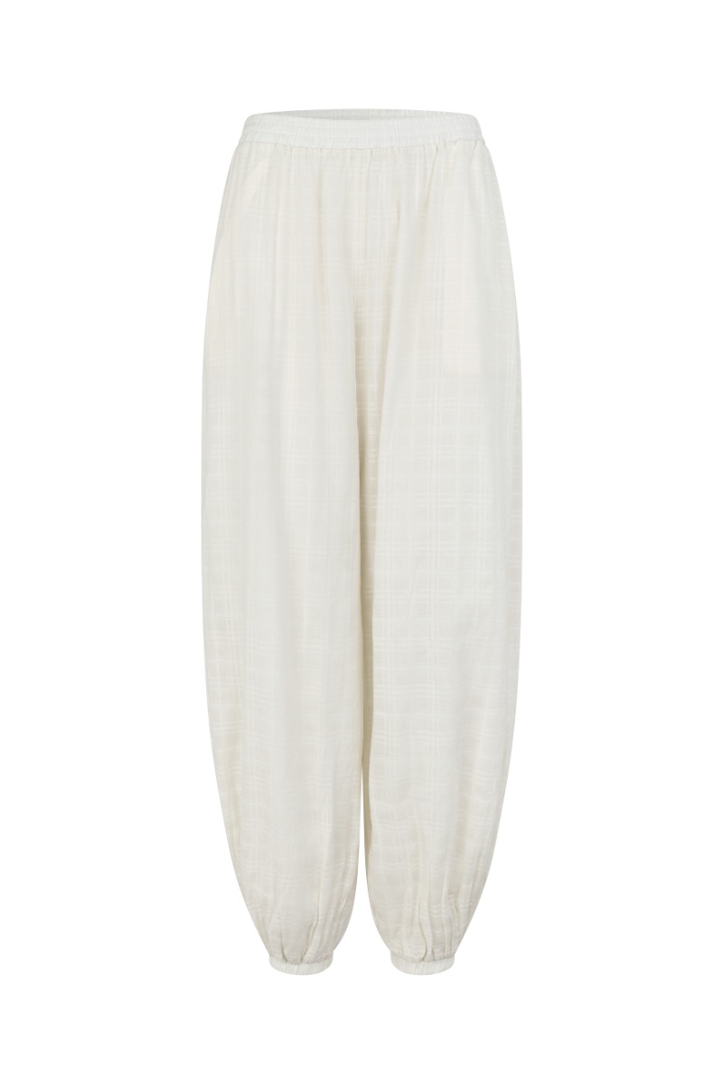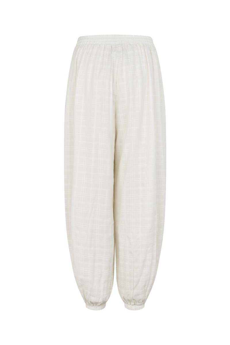 Luftige bukser i en blød cremefarve med diskret tone-i-tone struktur, der giver et let og afslappet udtryk. Modellen har elastisk talje for en behagelig pasform samt løse ben med elastikkant ved anklerne, som skaber en moderne silhuet. Perfekte til både hverdagsbrug og afslappede sommerlooks, hvor komfort og stil går hånd i hånd.
