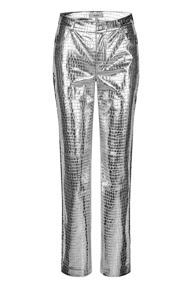 WAUW, de sejeste bukser fra MbyM i sølv croco. Benene har et lige snit der sidder løst med fast linning og bæltestropper. De har en tydelig syning over knæet der skaber en cool detalje. De er siper seje at bruge med en oversize grov strik eller til fest med stiletter og en feminint top!