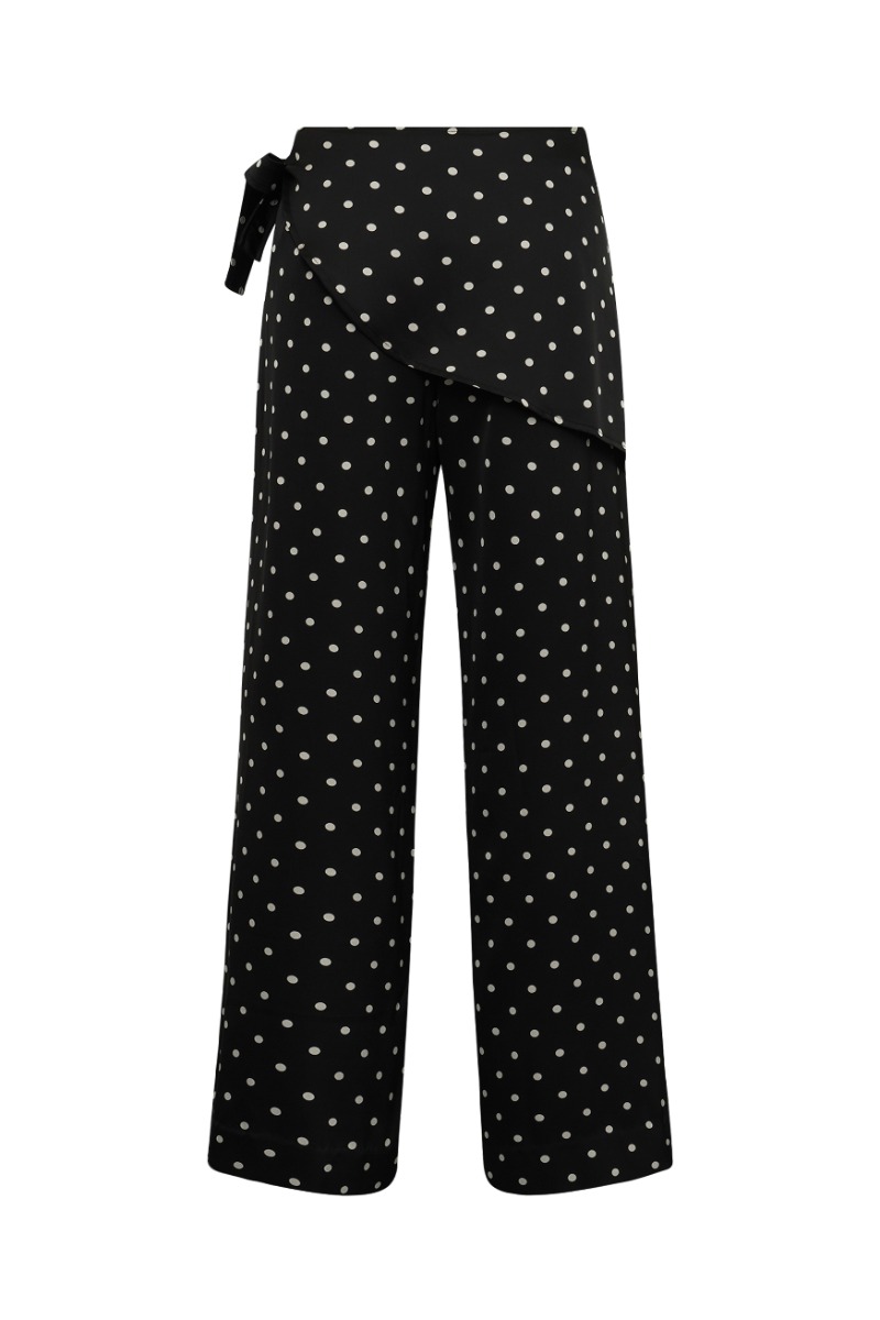 En par skønne bukser fra mbyM er kommet her i sort med hvide prikker. Den er med vide i benene og har denne tørklæde detalje som er en helt stro trend lige nu. Der findes en matchende overdel så du nemt kan lave et sæt. Ellers er den også fine med en simpel t-shirt.
