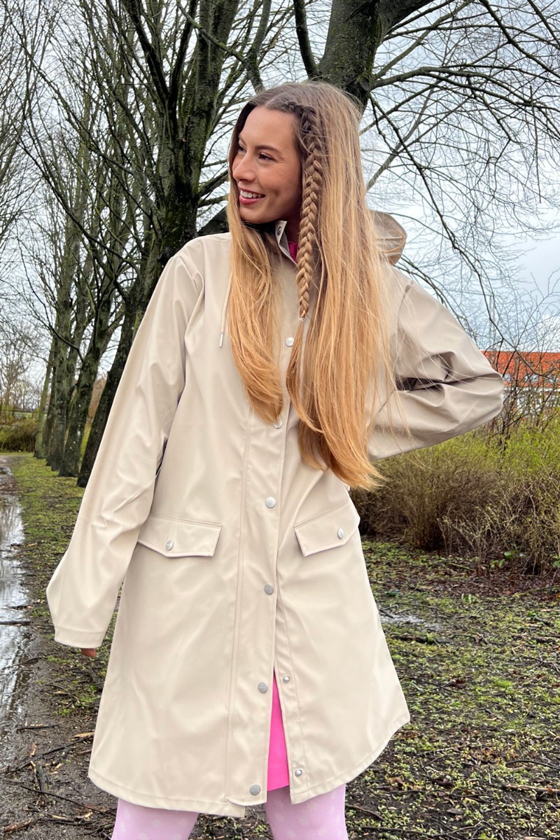 Oversize regnjakke fra mbyM i sandfarvet med knapper foran i sølv. Jakken har hætte der kan snøres ind med snører foran. Modellen har plads til en ekstra striktrøje til de lange gåture.