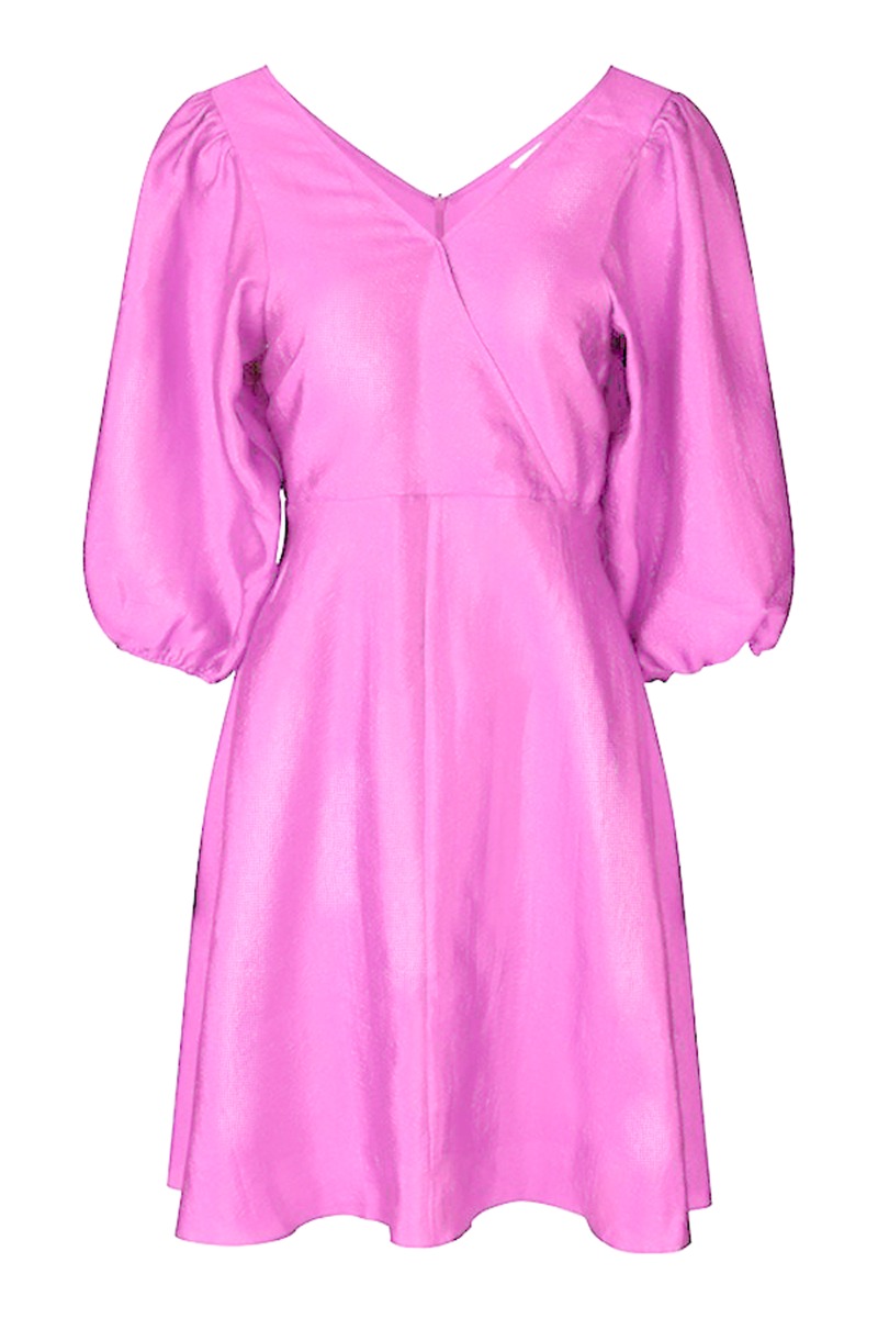 En rigtig SMUK festkjole er landet og vi er ved at dø over den!! Kjolen er designet i en feminin pasform med en smuk talje og v-udskæring samt pufærmer. Den har shineeffekt og er det perfekte valg til de kommende fester.