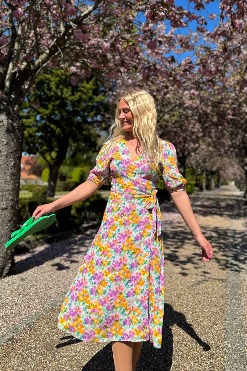 mbyM har altid været gode til at lave smukke sommerkjoler - og her er ingen undtagelse. Denne kjole er en slå-om model med blomsterprint og skønne forårsfarver. Kjolen har korte ærmer som afsluttes med elastikkant og den lette kvalitet gør den nem at ånde i. Brug den gerne sammen med et par strømpebukser.