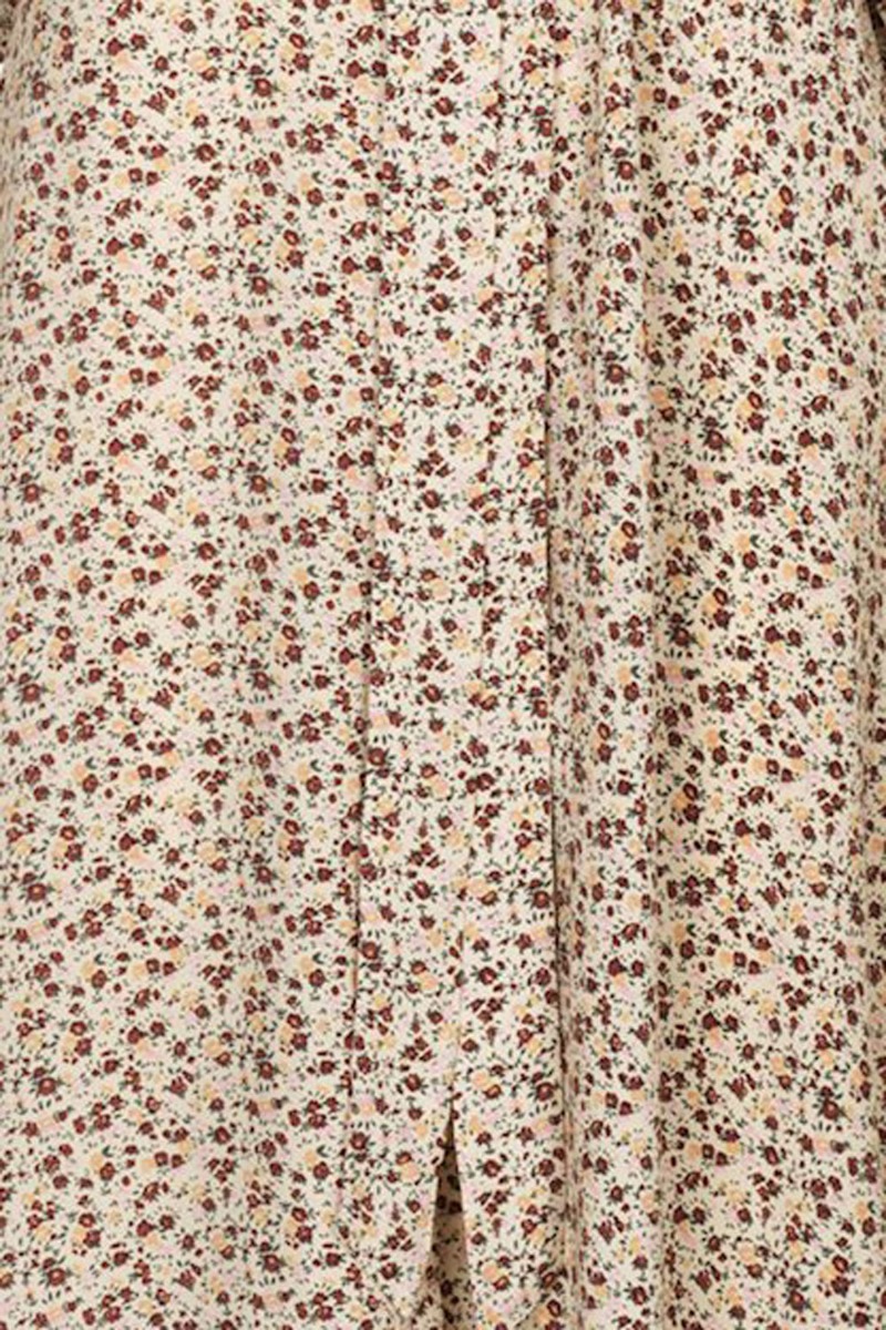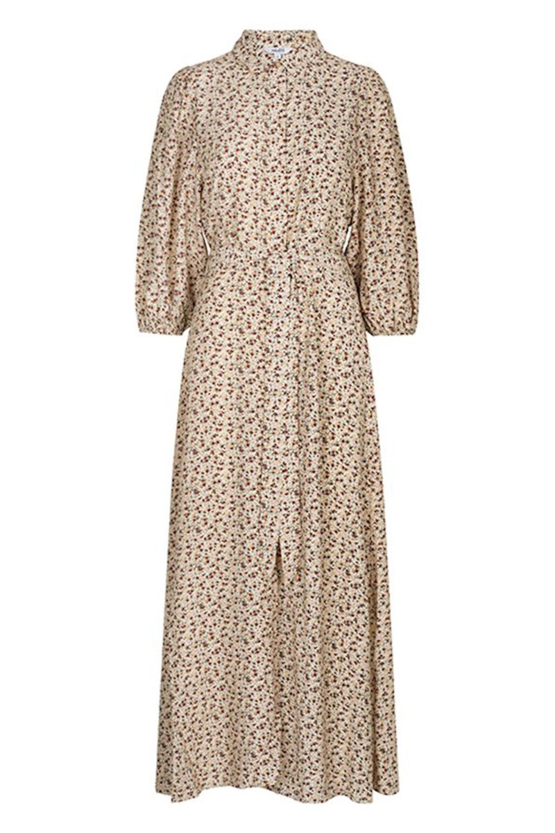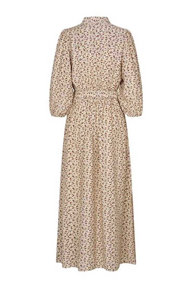 Smukkeste pasform fra mbyM med en beige bundfarve og et fint lille blomsterprint i bordeaux, gule og rosa nuancer. Kjolen har knapper hele vejen ned og går ind i taljen med bindebånd. De smukke volumiøse ballonærmer afsluttes med elastikkant. En kjole der er anvendelig til alle anledninger.