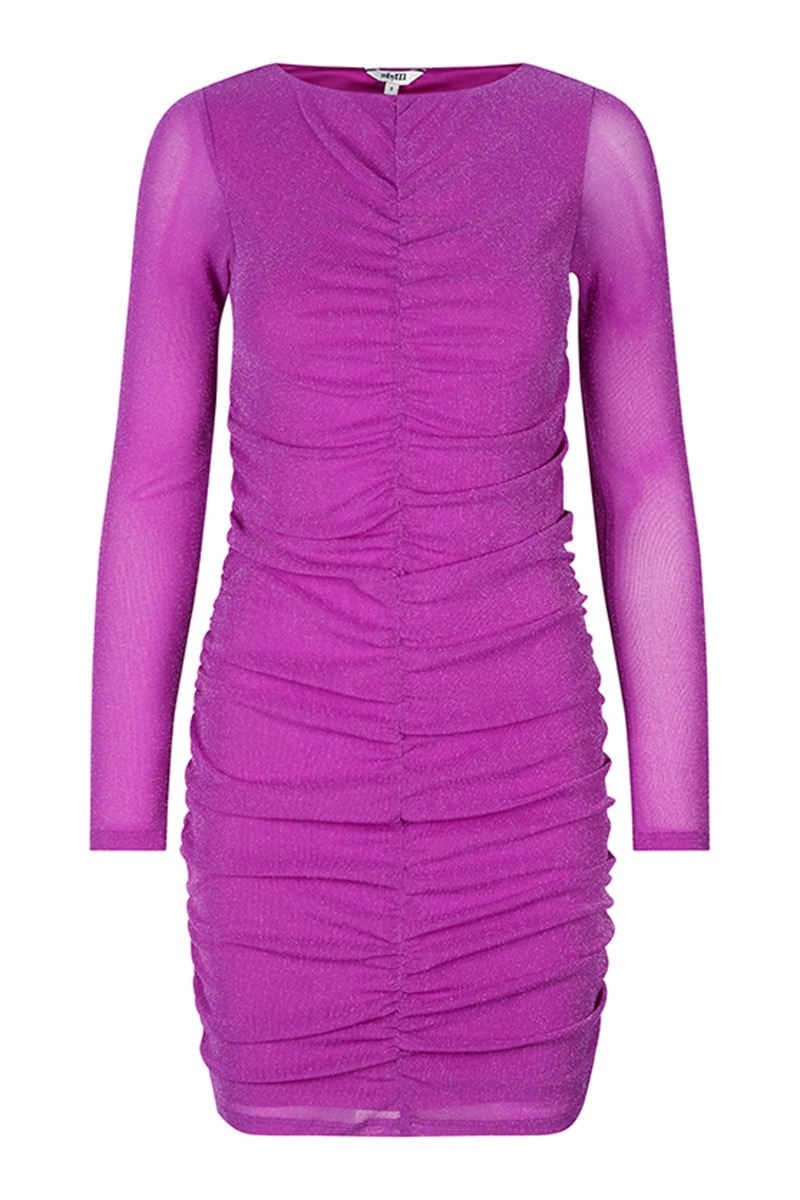 Fantastisk smuk tætsiddende kjole fra mbyM i lilla farve med glimmereffekt. Kjolen har rynke detaljer foran og i siderne som giver den bedste pasform. Kjolen har lange ærmer og er super fin med en farvet blazer.