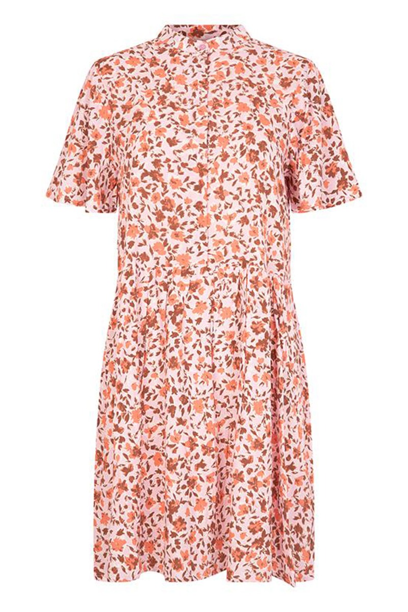 En skøn kjole fra mbyM i et fint print i ornage nuancer. Den er lavet med en pasform der er løs og derfor passer de fleste. Den har korte ærmer, knaplukning til taljen og kinakrave. Derudover er kvaliteten dejlig let og er nemt at bruge til sommer.