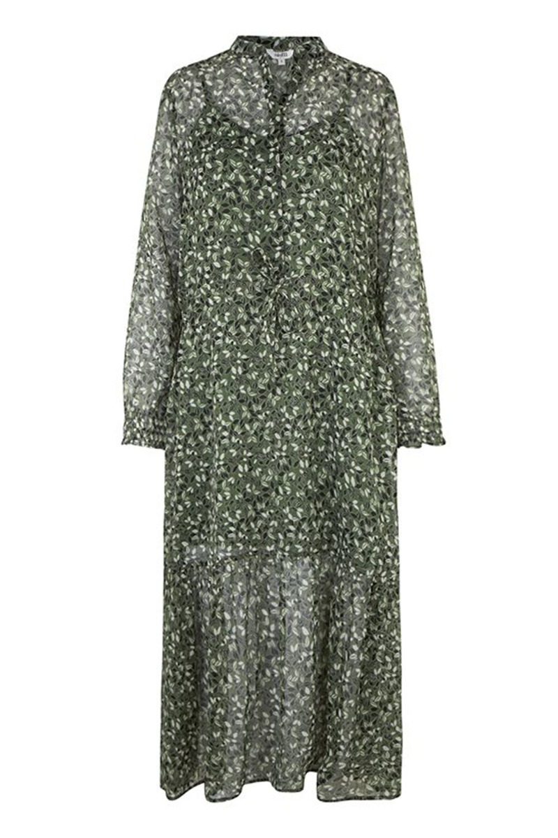 Den populære Diaz kjole fra mbyM er kommet i en flot army farve med blad print i sort og hvid der giver et klassisk look. Kjolen har bindebånd i taljen der kan snøres ind efter eget ønske og knapper ned til livet. Den er lavet i et let gennemsigtigt materiale og er foret indvendigt. De lange ærmer afsluttes med med en lille smockdetalje. Style den både med sneaks, sandaler og stiletter. En kjole der bare kan det hele!