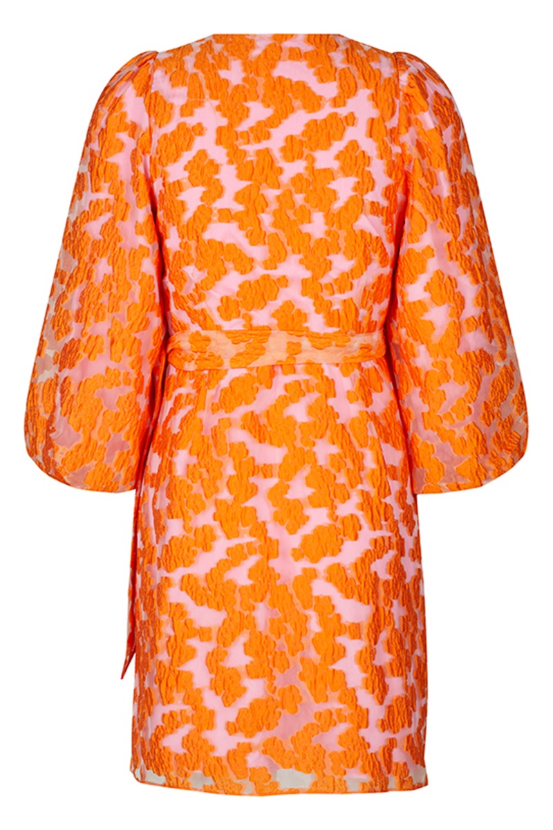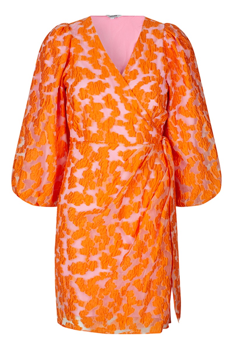 WAAAAUV!!! Piger tjek lige denne her favorit! Den er SÅ flot!! Kjolen er fra mbyM og er i det smukkeste orange og transparente materiale med et fint mønster. Der er lyserød underkjole, som er en sindssygt fed detalje til den orange farve. Kjolen har et bredt bindebånd i taljen på den venstre side af kjole, der giver en smuk slå om effekt. Der er V-udskæring når kjolen er lukket og så er kjolens ballonærmer bare vildt smukke og perfekt puffet.