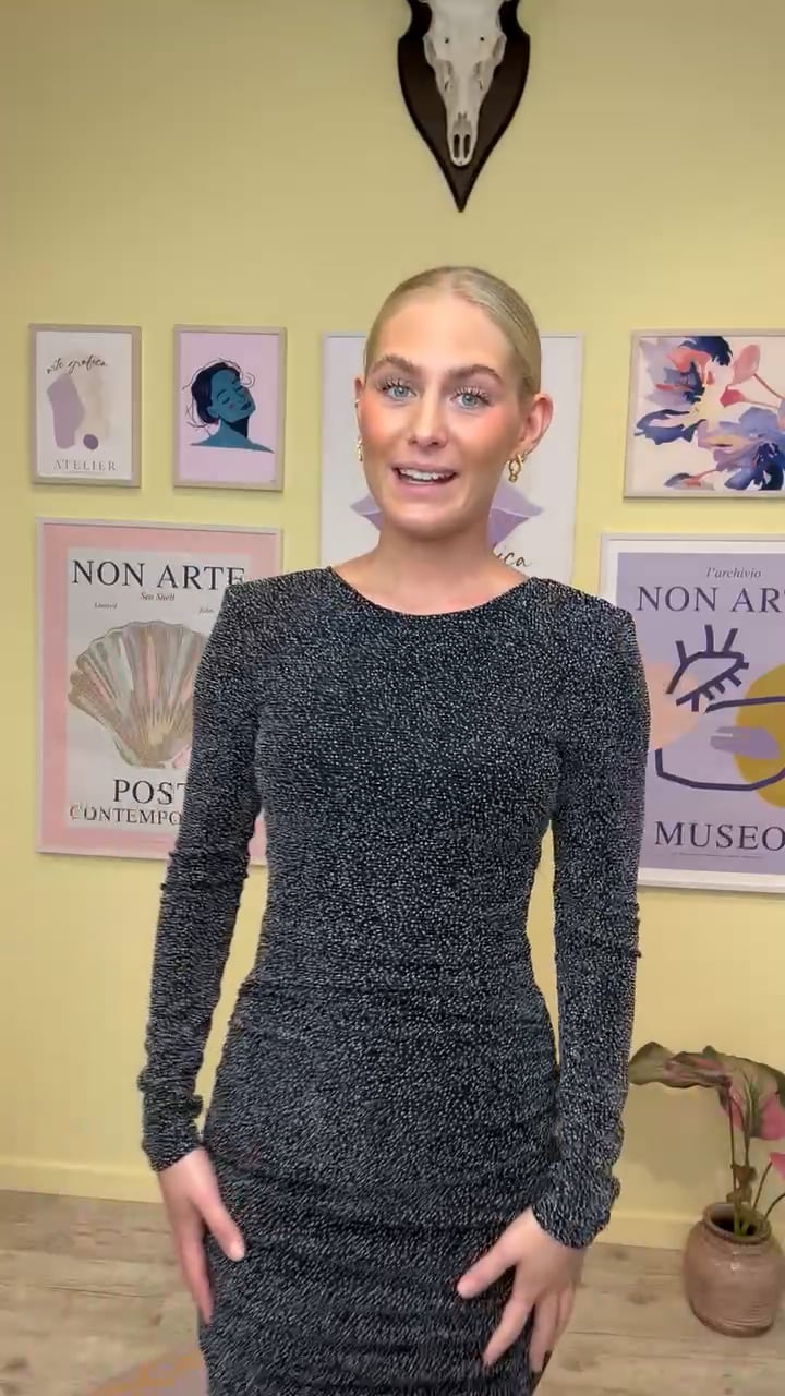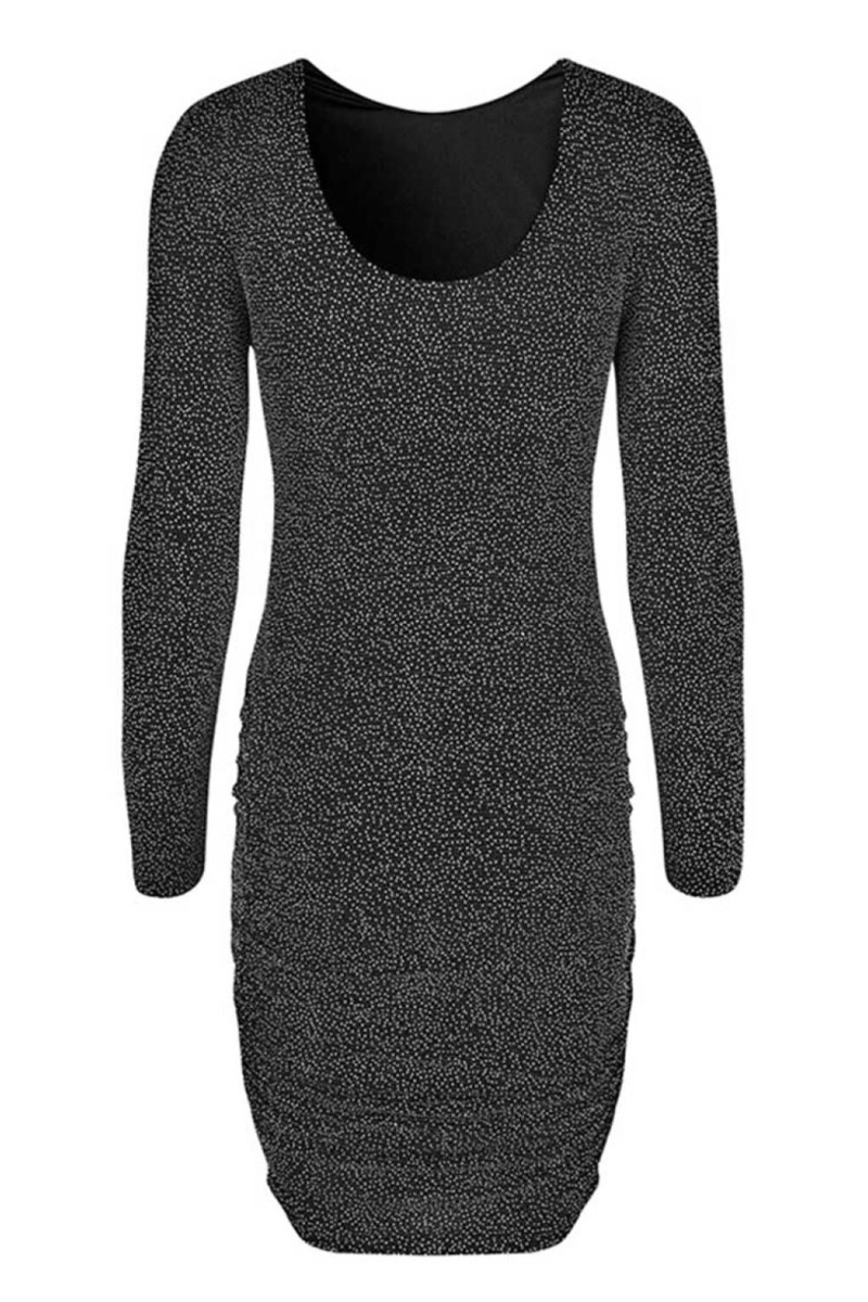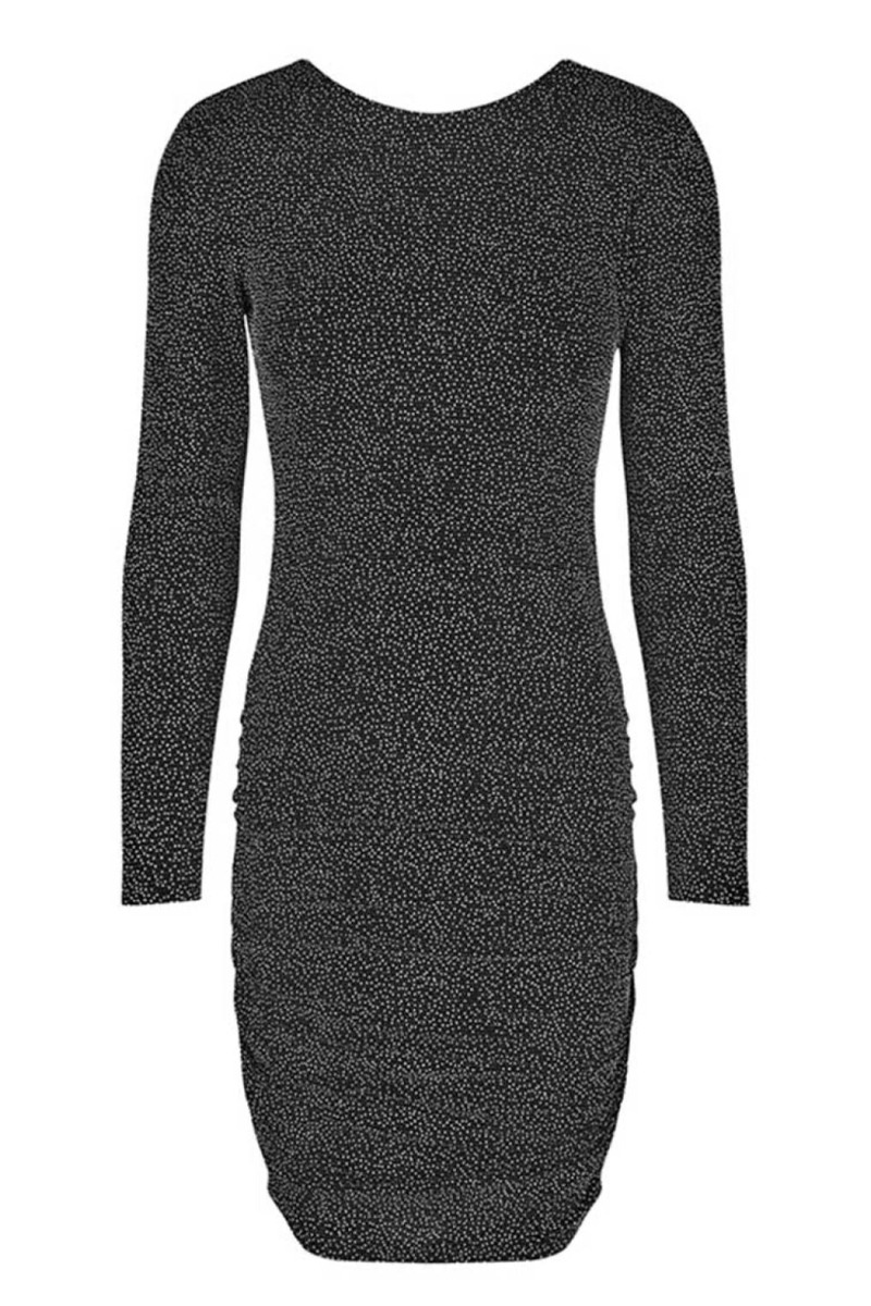 Tætsiddende kjole fra MbyM med sort baggrund og det fineste glimmer mønster med små hvide prikker. Kjolen er lavet i et strækbart materiale med rynkedetalje i siderne der kan justeres efter eget behov. Den har rund hals-udskæring foran og går en smule ned bagtil hvilket giver et utrolig flot og feminint udtryk.