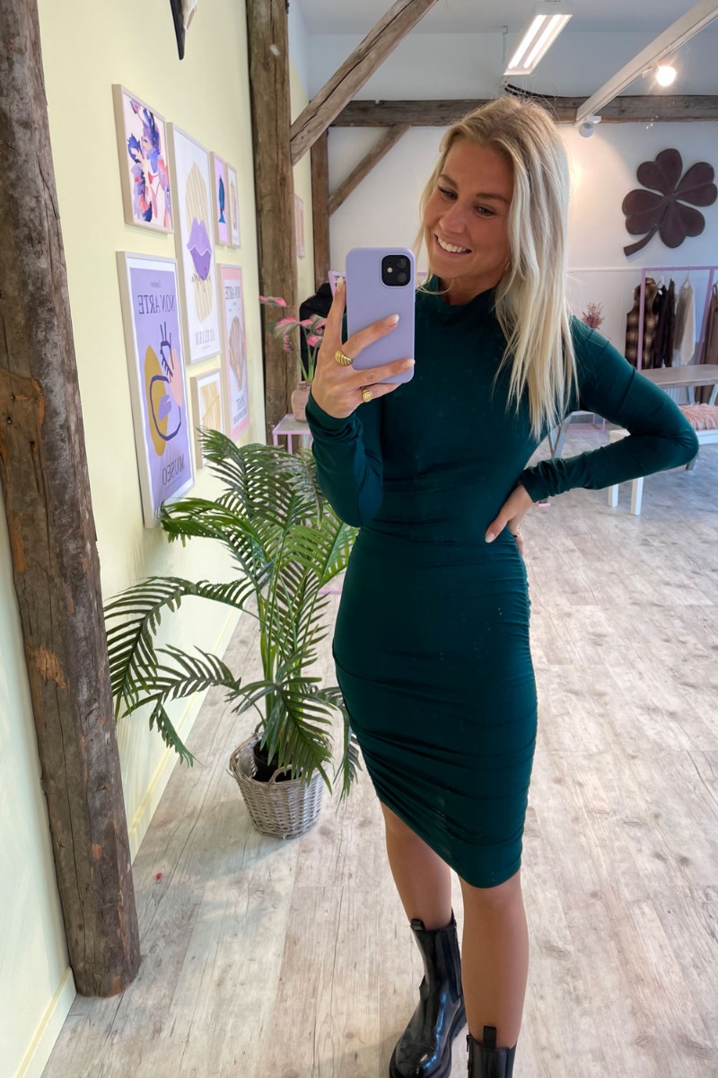 Grøn kjole med t-neck fra MbyM i et helt enkelt look med rynkeeffekt i siderne. Den er lavet i det blødeste materiale der ikke krøller og er perfekt at style med en babybule også. Kjolen har lange ærmer og kan justeres i længden efter eget ønske.