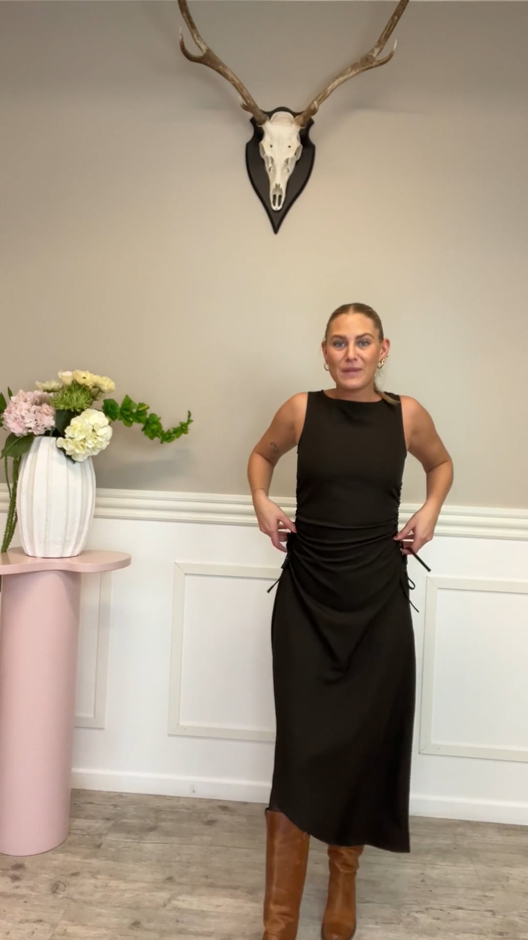 En smuk asymmetrisk kjole fra MbyM er kommet til denne sæson. Den er i mørkebrun og derfor elegant til fest med en stilet. Den har draperingsdetaljer i taljen i begge sider, dette gør at den sætter sig flot og danner denne timeglas figur men uden at stramme.