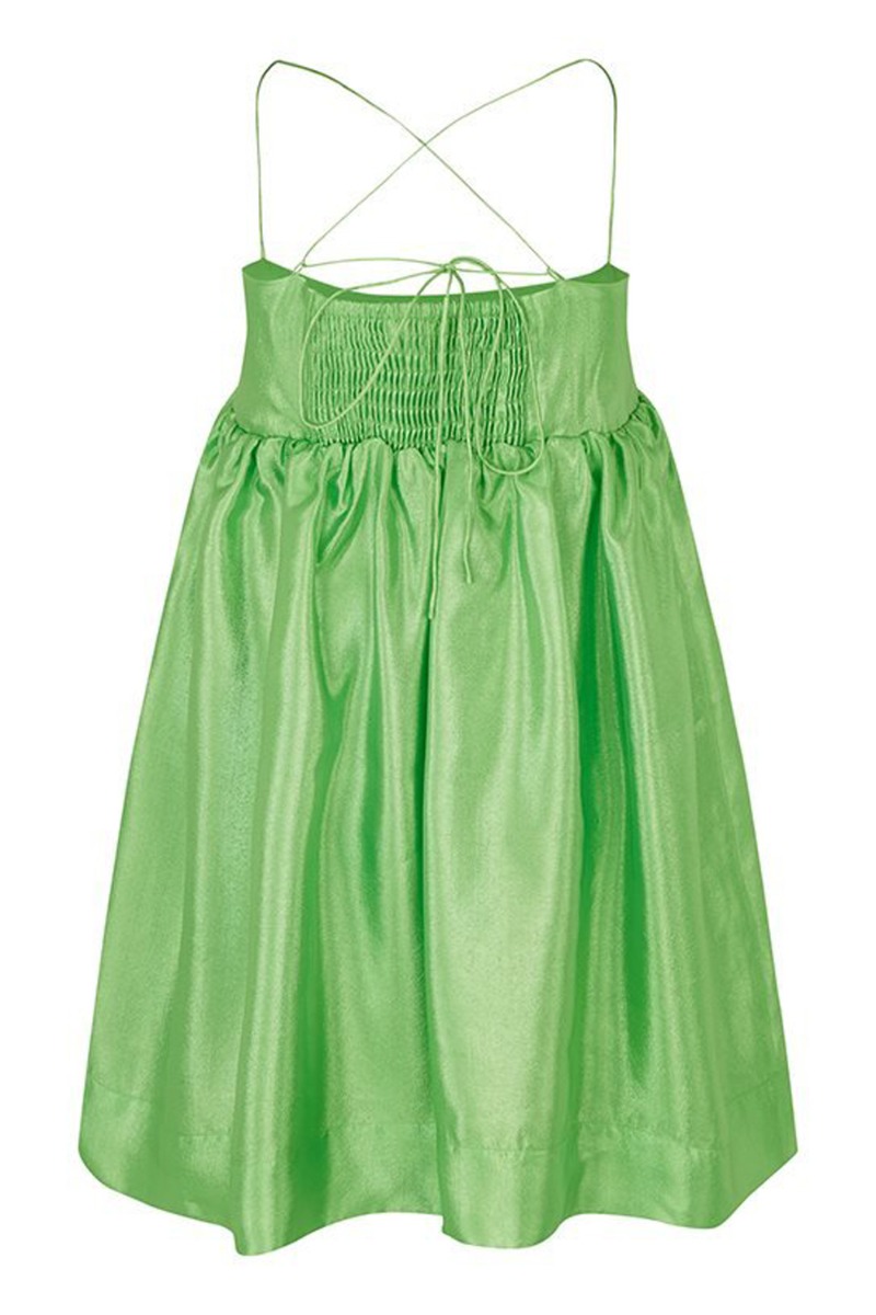 Du kommer til at være dagens midtpunkt med denne smukke MbyM kjole. Kjolen er grøn med shineeffekt og den smukkeste ryg der snøres. Den har et smukt ballonsnit med en tydelig syning under barmen. Style den med en stilet.