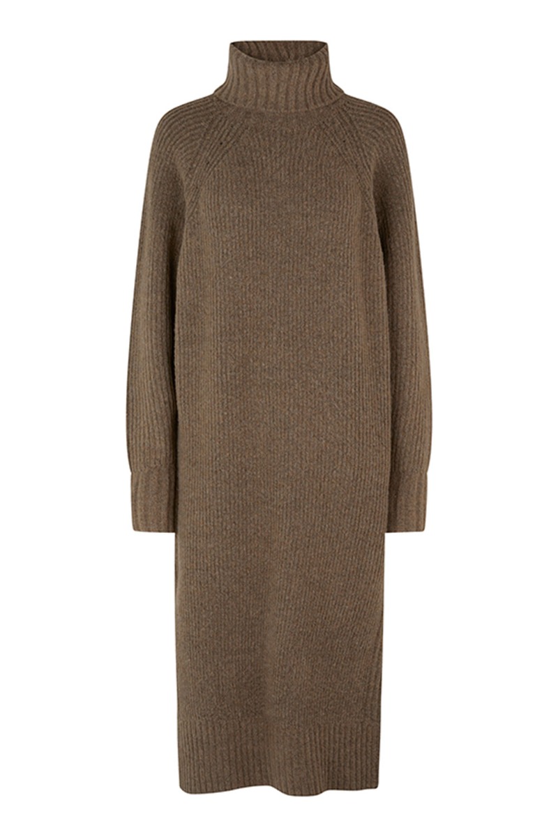 Super lækker og blød strikkjole fra mbyM i en smuk brun farve. Kjolen har en løs og rummelig pasform med lange løse ærmer og en høj hals. Foran på brystet har den "huller" som detaljer som falder smukt sammen med mønstret i kjolens materiale. En kjole som holder dig varm hele efteråret og vinteren.
