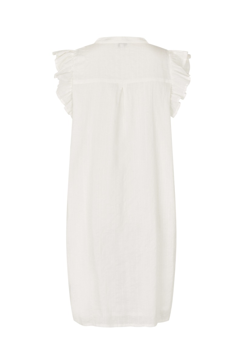 En fin kjole fra mbyM er kommet i hvid og faktisk er det en bluse model vi kender som vi nu har fået i en kjolemodel. Den er løst siddende og har V hals samt små flæse ved ærmegabet. Den er fin til et par sandaler eller til fest med en stilet.