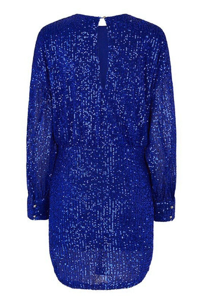 Waaauv så kan der godt blive fest! Denne kjole fra MbyM er da lig med party og vi ELSKER det. Kjolen er en flot palietkjole i blå/lilla nuancer. Kjolen har en løs pasform i den øverste del af kjolen, og sætter sig super flot til hofterne, hvilket giver en "mini-skirt" effekt, der bare er spot on. Der lukkes med knap i nakken, som giver et åbent hul på den øverste del af ryggen.