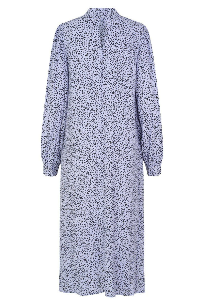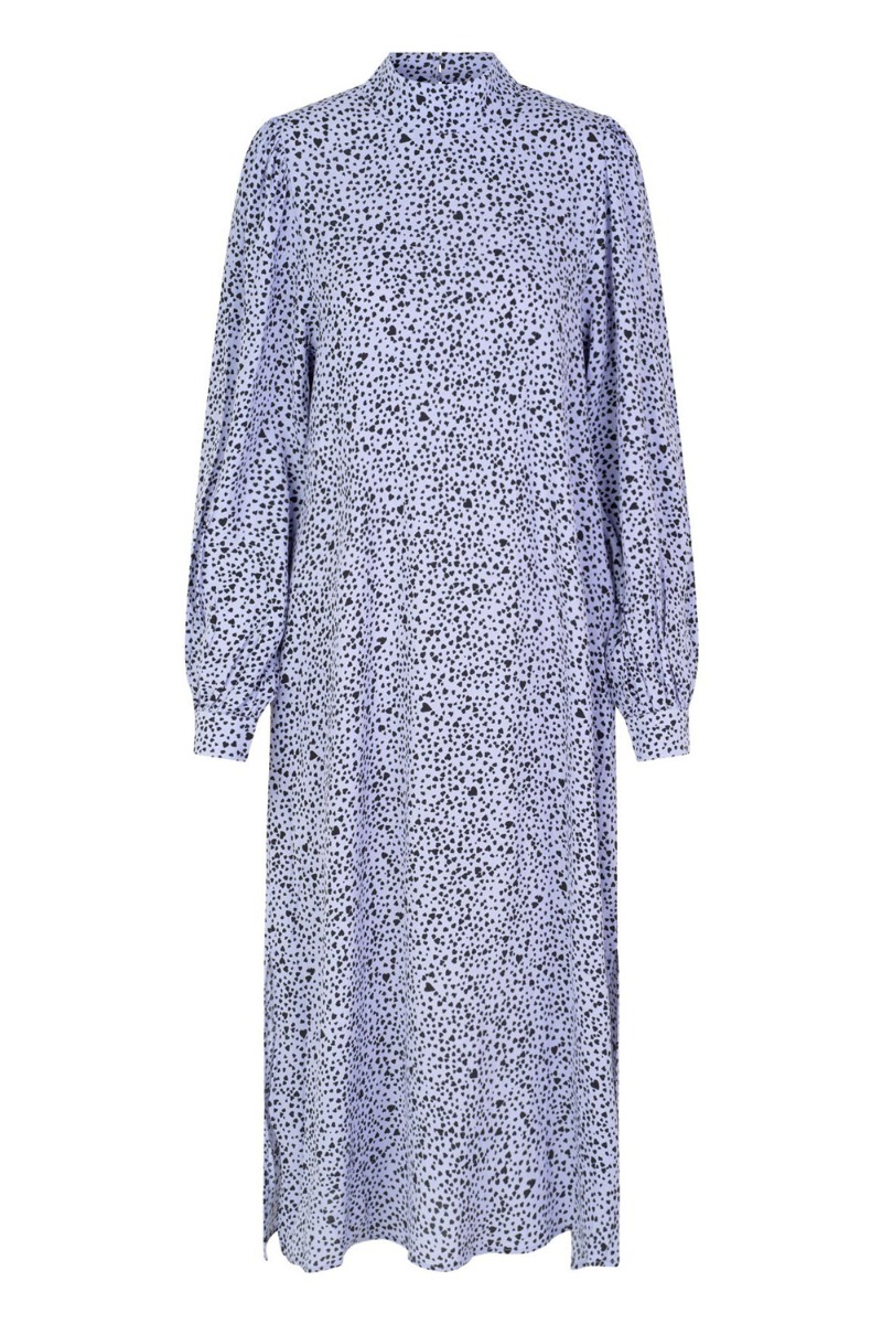 Lilla kjole med sorte prikker fra MbyM. Kjolen er lavet i en let kvalitet med o-neck der lukkes i nakken med tre knapper der giver en dråbeformet åbning. De lange ærmer knappes med stofbetrukket knapper ved håndleddet og har slids i hver side. Style den både til fest og hverdag.