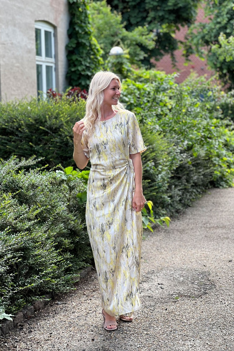 En smuk kjole i en flot gul kvalitet med satin look fra mbyM. Den er med slå-om model med fast syet ved halsen og derfor kan den ikke åbnes helt. Den er med sløjfe bagpå ved nakken og med korte ærmer.