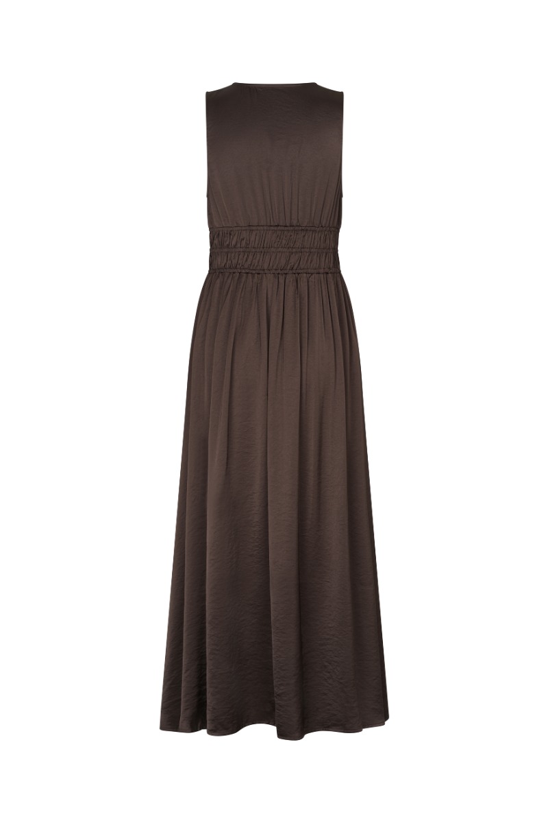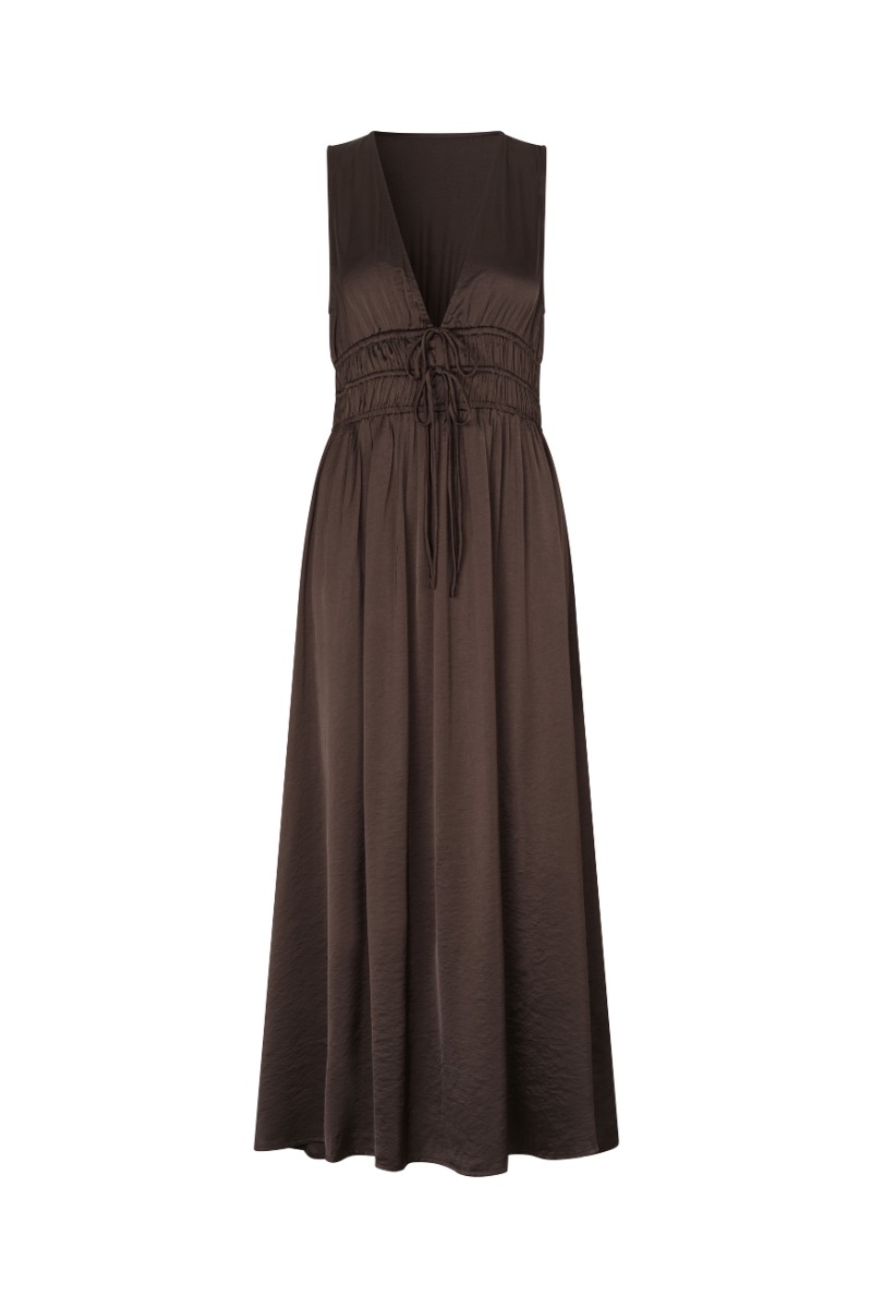 Kjolen er designet i en dyb brun nuance med et enkelt og elegant udtryk. Den har en flatterende V-udskæring og et ærmeløst snit, som giver et let og feminint look. Taljen er markeret med elastiske smock-detaljer og bindebånd foran, der skaber en smuk silhuet. Skørtet falder blødt og løst i fuld længde og giver god bevægelse. Kjolen er ideel til både hverdagsbrug og mere afslappede festlige anledninger.