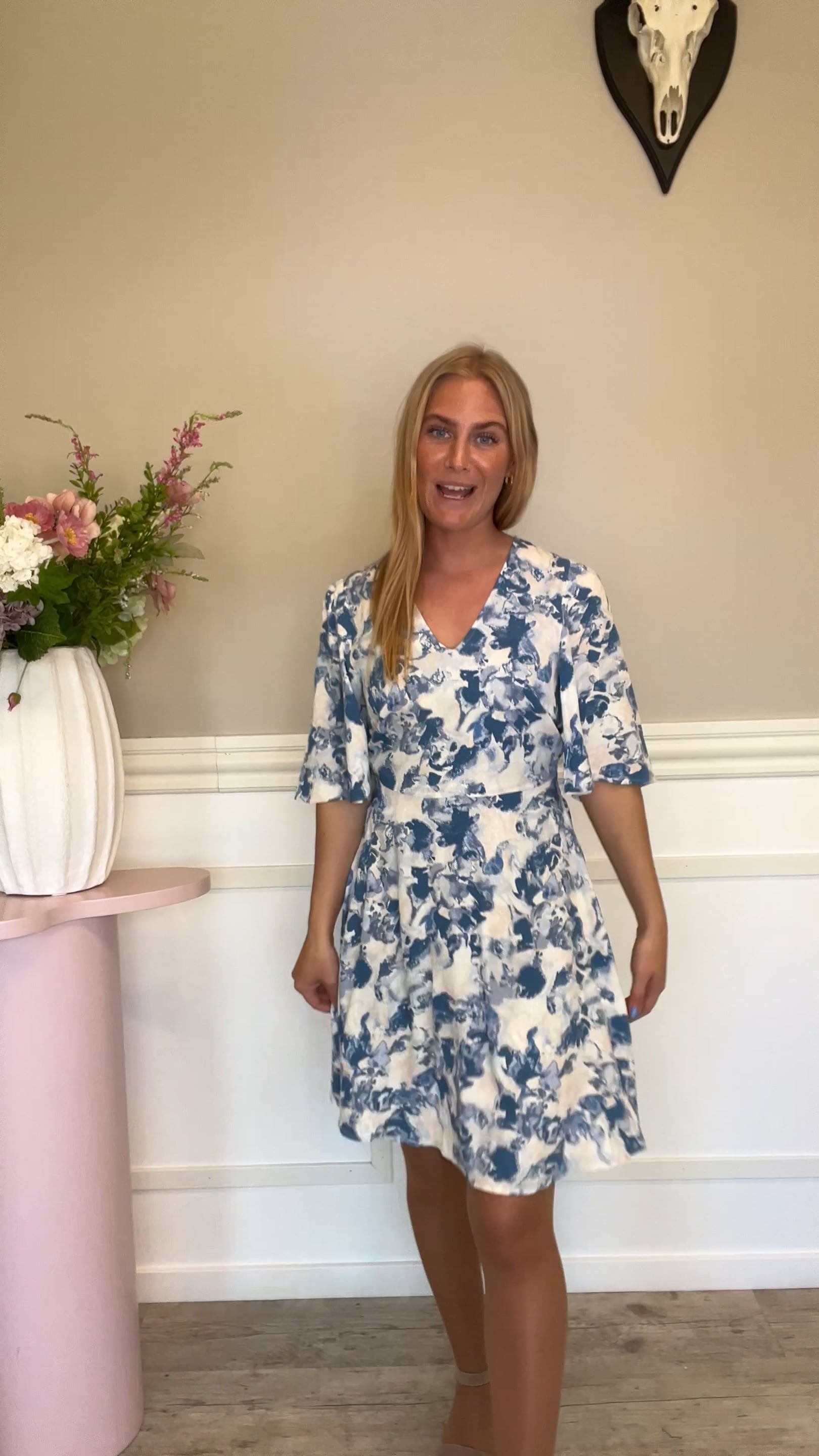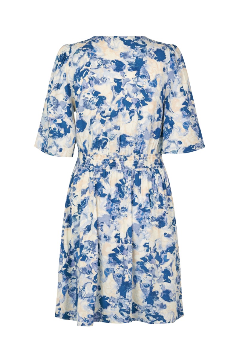 Kjole fra MbyM. Denne kjole har en afslappet pasform, store ærmer, v-hals og et let materiale. Den har fine farver og går til midt på låret. En super sød kjole både til hverdagsbrug og forårets/sommerens festlige begivenheder.