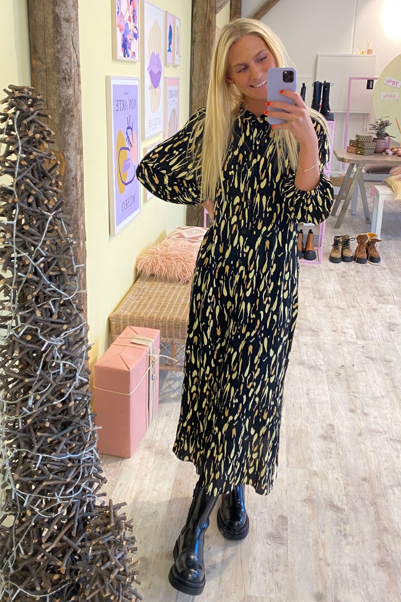 Sort kjole fra mbyM med et grafisk gult print. Kjolen er lang med slids i begge sider og knapper hele vejen ned der gør den ammevenlig. De 3/4 lange ærmer afsluttes med et løst elastikdetalje der giver et fint ballonsnit. Denne kjole kan både styles feminint lukket eller bruges åben med en t-shirt og jeans under.