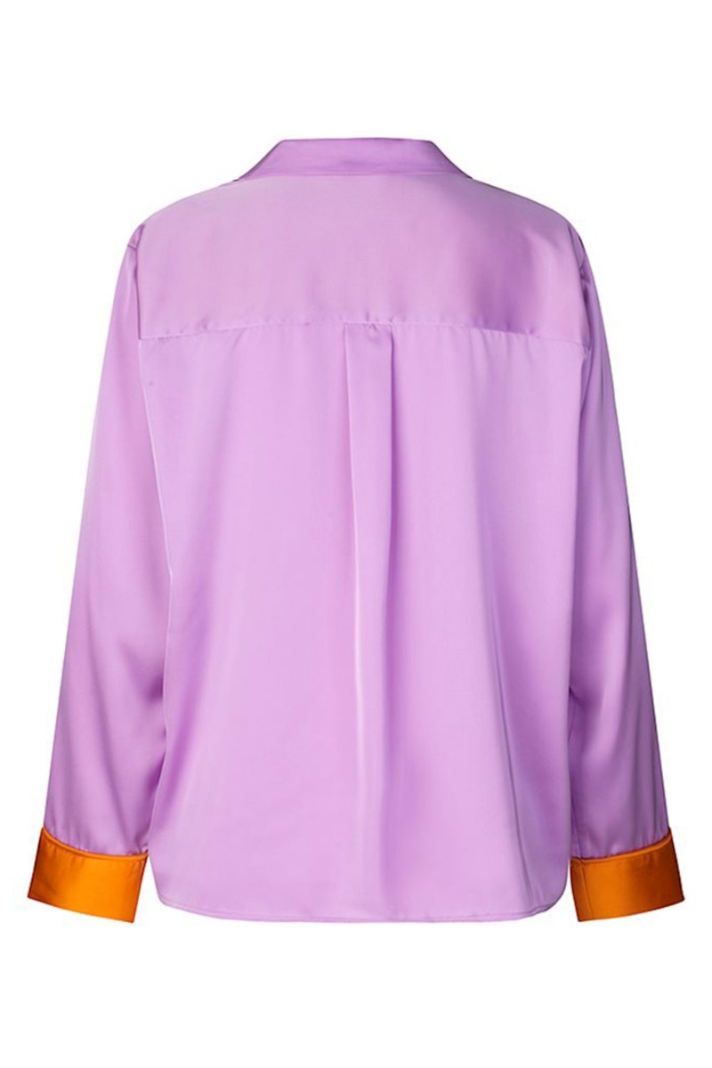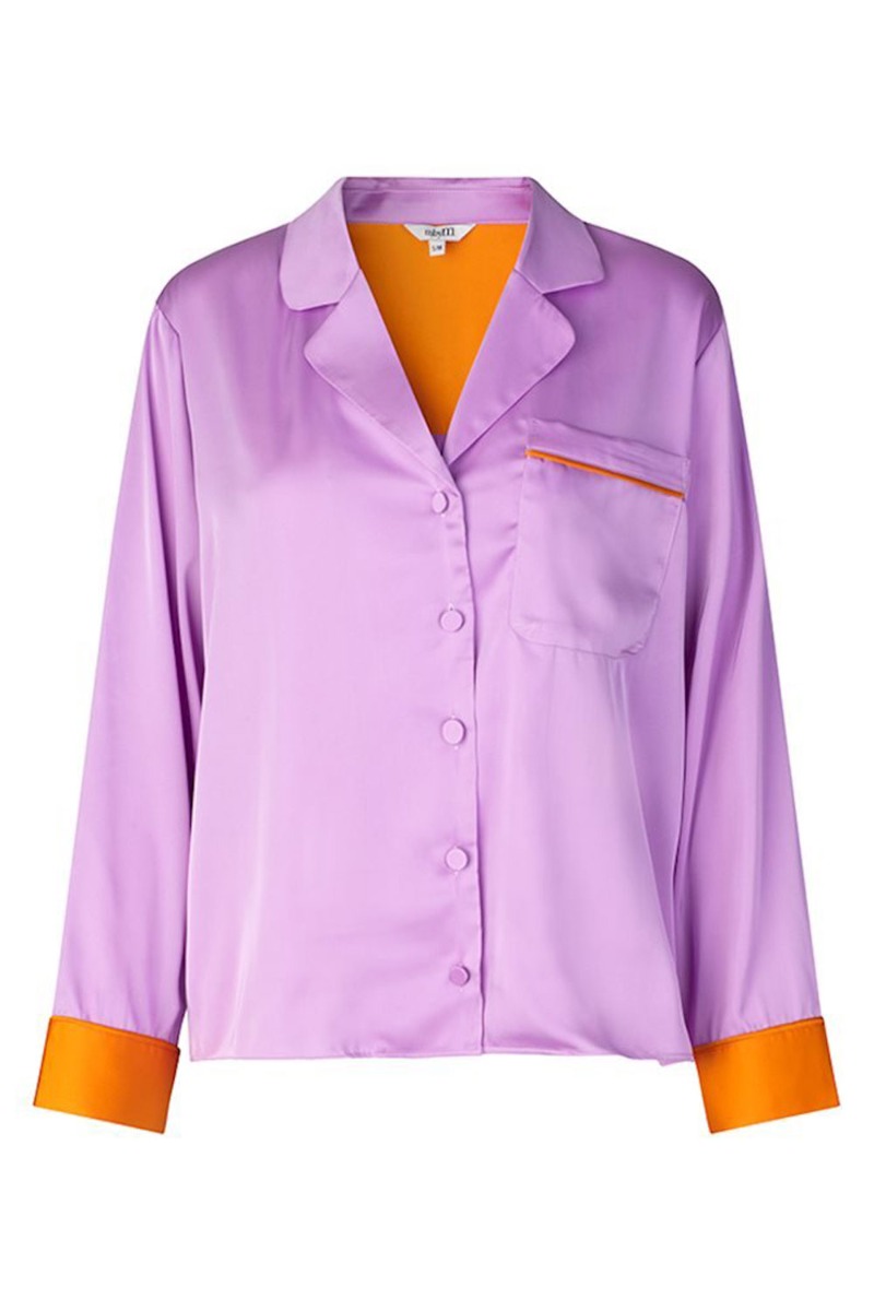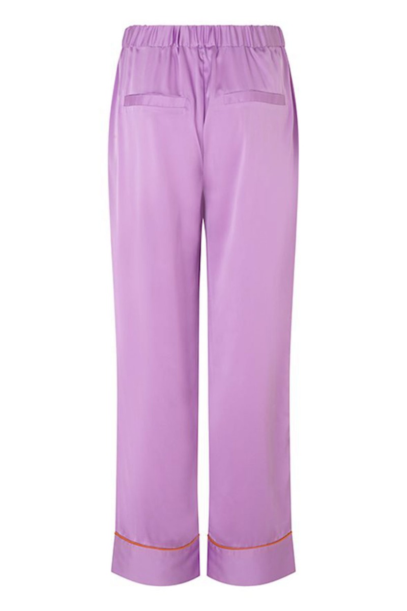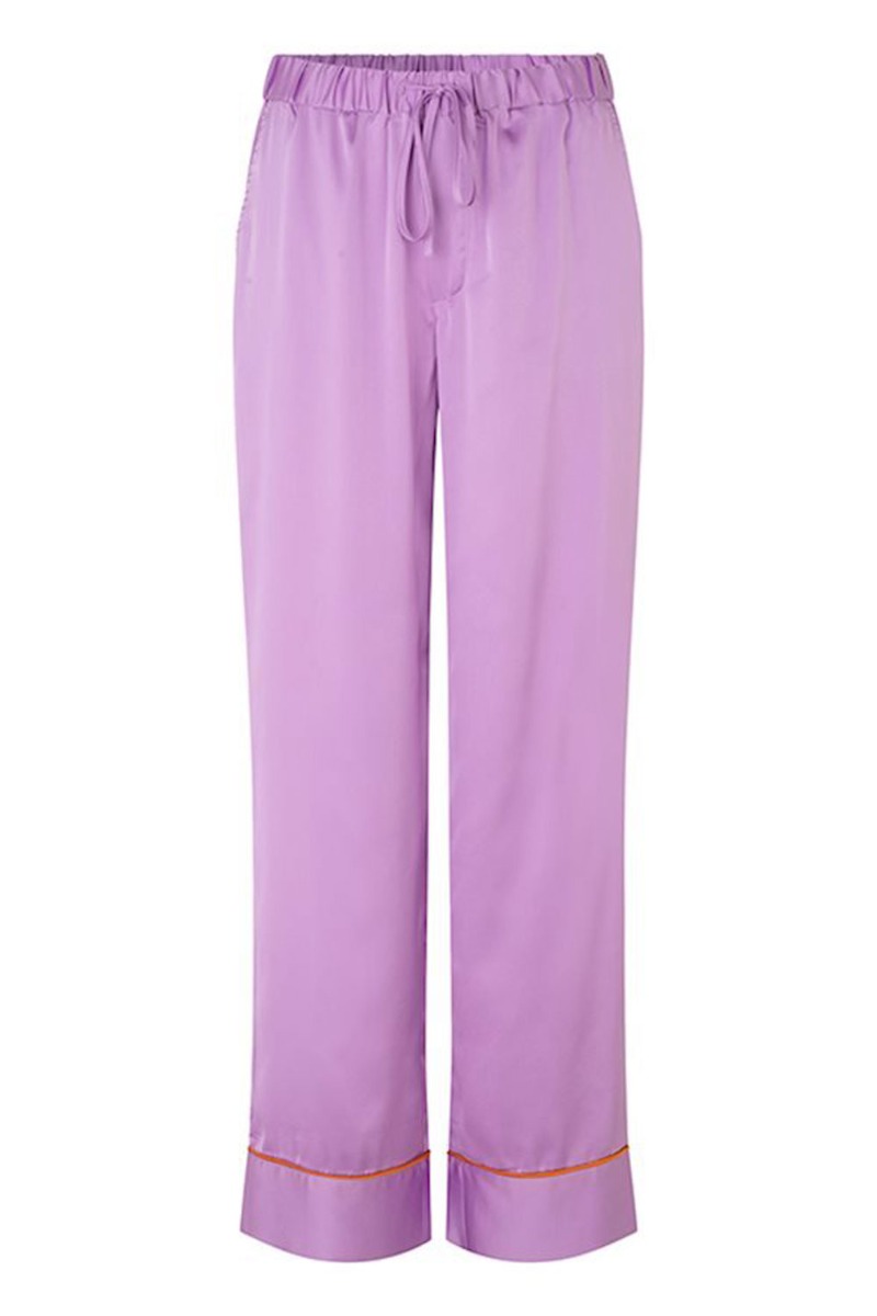 Et total LYKKE natsæt fra mbyM !! Dette sæt er lavet i den smukkeste farvekombination, nemlig lilla og orange med et shiny silkelook. Bukserne er brede i benene med elastik i taljen og skjorten er løstsiddende og lukkes med knapper foran. Det sælges som sæt og har matchende "sleeping beauty" sæt.