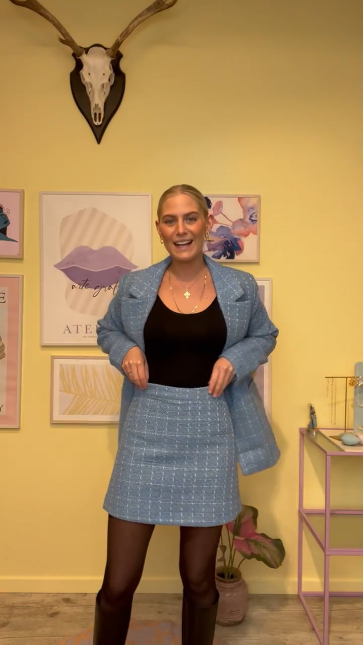 Den flotteste nederdel fra mbyM i blå bouclé materiale. Bouclé er dette kraftigt vævet stofkvalitet som giver et rigtig flot spil til nederdelen. Der er lynlås i siden og et matchende satin for indeni. Brug den gerne sammen med den matchende blazer.