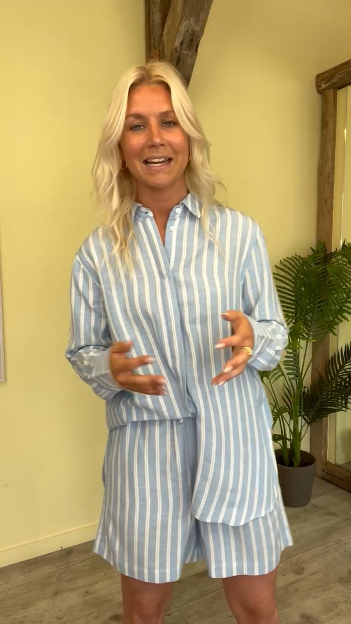 En sød skjorte fra mbyM er kommet med striber i hvid og lyseblå. Den er med klassisk skjortekrave og er i en lang model med en løs pasform. Derudover er den i en lækker blød kvalitet. Der findes en matchende skjorte så du nemt kan lave et sæt.