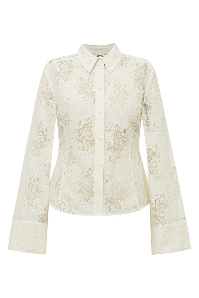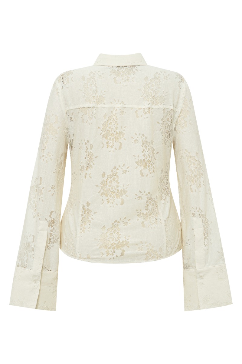 Skjorten fremstår let og elegant i en blød cremefarve med et fint tone-i-tone blomstermønster, der giver stoffet dybde og et feminint udtryk. Den har klassisk krave og gennemgående knaplukning foran, hvilket tilfører et tidløst og stilrent look. Ærmerne er lange med brede manchetter, som skaber en moderne og sofistikeret silhuet. Pasformen virker let figursyet og giver et pænt fald langs kroppen. Samlet set er det en skjorte med et romantisk og eksklusivt præg, der kan styles både casual og mere formelt.