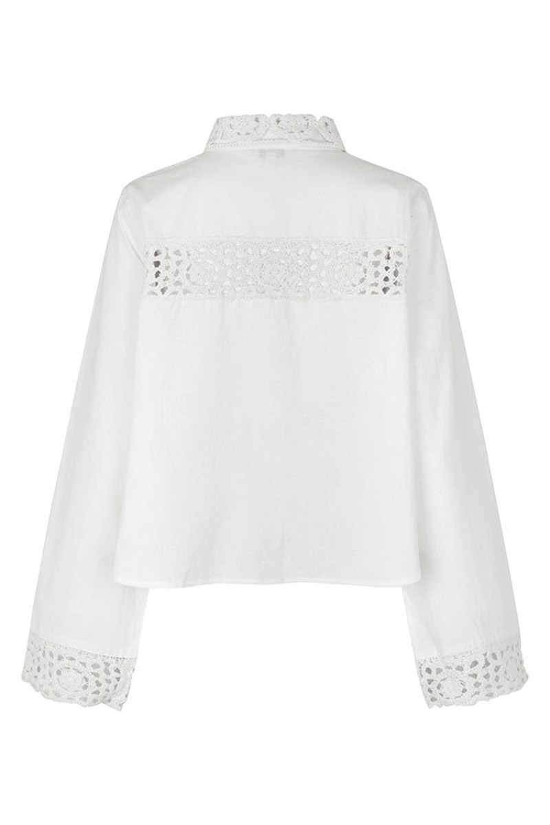 Den smukkeste skjorte fra mbyM er landet i en hvid farve. En hvid skjorte kan man altid bruge og denne er med små fine blonde detaljer. Detaljerne sidder ved brystet og ved kraven samt ved ærmet. Ærmet er bredt i bunden som giver et feminint udtryk.
