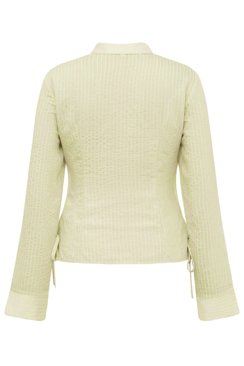 En pæn skjorte som er figursyet med striber i hvid og gul fra mbyM. Den er med med klassiske skjorte krave og har brede ærmer. Der er sat en lille sløjfe i bunden i begge sider. Den er ammevenlig og perfekt til et par jeans eller en nederdel.