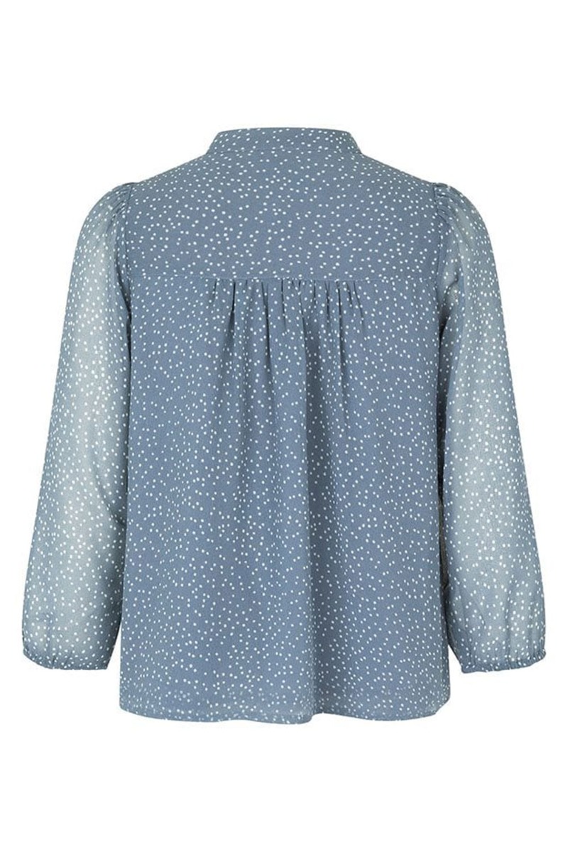 Sød enkel skjorte fra MbyM i en flot farve med små hvide prikker. blusen har et klassisk snit med 3/4 ærmer der afsluttes med elastik i enden. Den knappes foran og er foret ved kroppen så du ikke skal tænke på at have en top under. Style den med shorts, nederdel eller bukser.