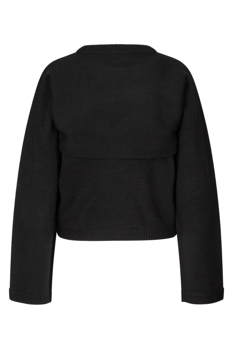 Sort strik fra MbyM i den sejeste cut-out model. Strikken har brede ærmer og en rund halsudskæring. Strikken er til den kortere side, hvilket gør den oplagt at style til vores højtaljede jeans og nederdele.