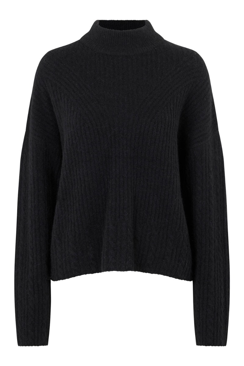 Den blødeste strik er landet fra mbyM i sort. Strikken er oversized i pasformen og har en turtleneck. Strikken er med masser af stræk og er passer perfekt sammen med et par højtaljet jeans eller en nederdel. Den findes også i grå.