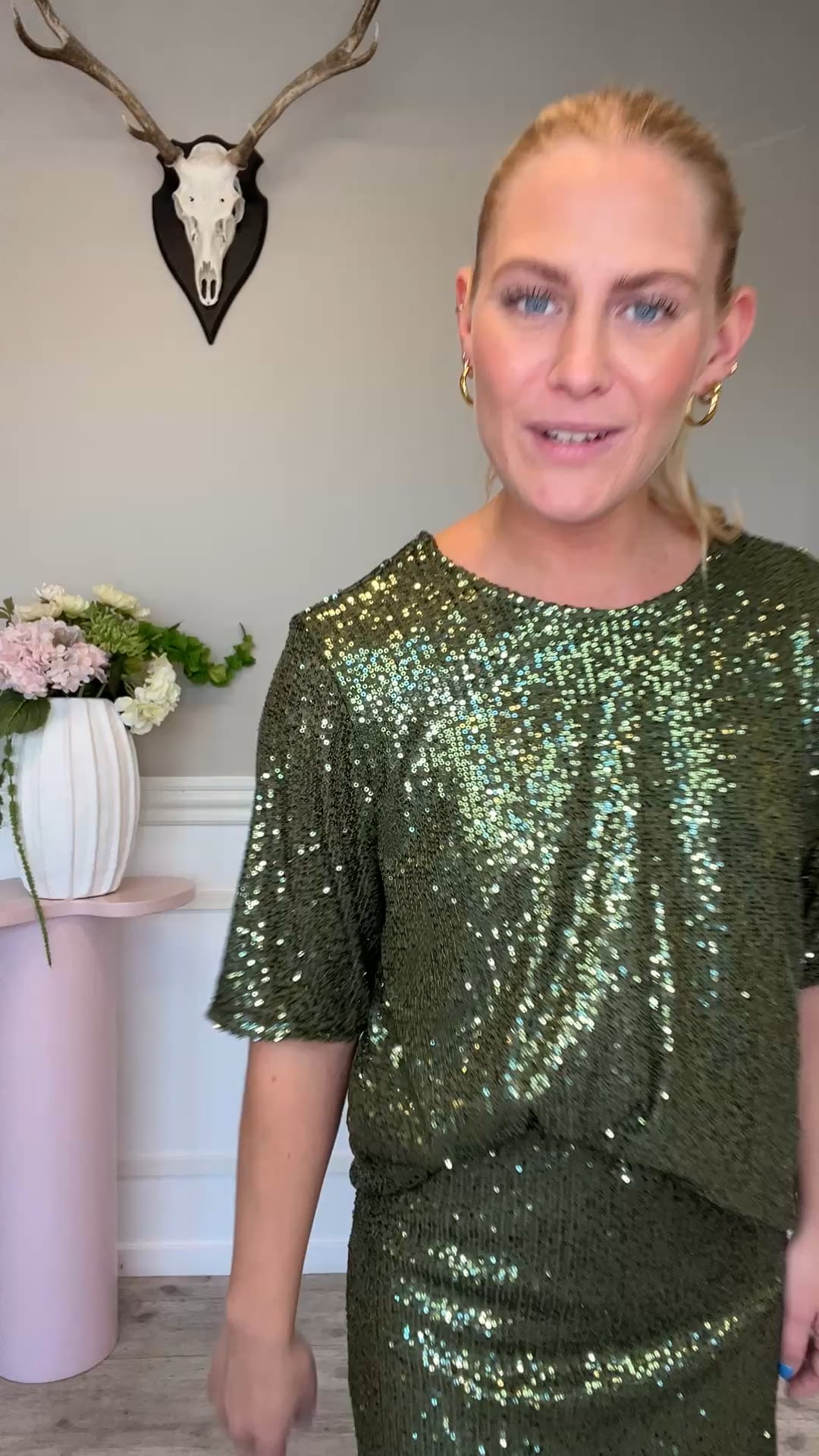 T-shirt fra mbyM. Denne t-shirt har et festligt udtryk med den glitrende paillet design! Den har en super flot grøn farvenuance, korte ærmer og lukkes i nakken med en knap. Den er perfekt til særlige anledninger, men bestemt også cool til et par jeans og sneaks til hverdag.