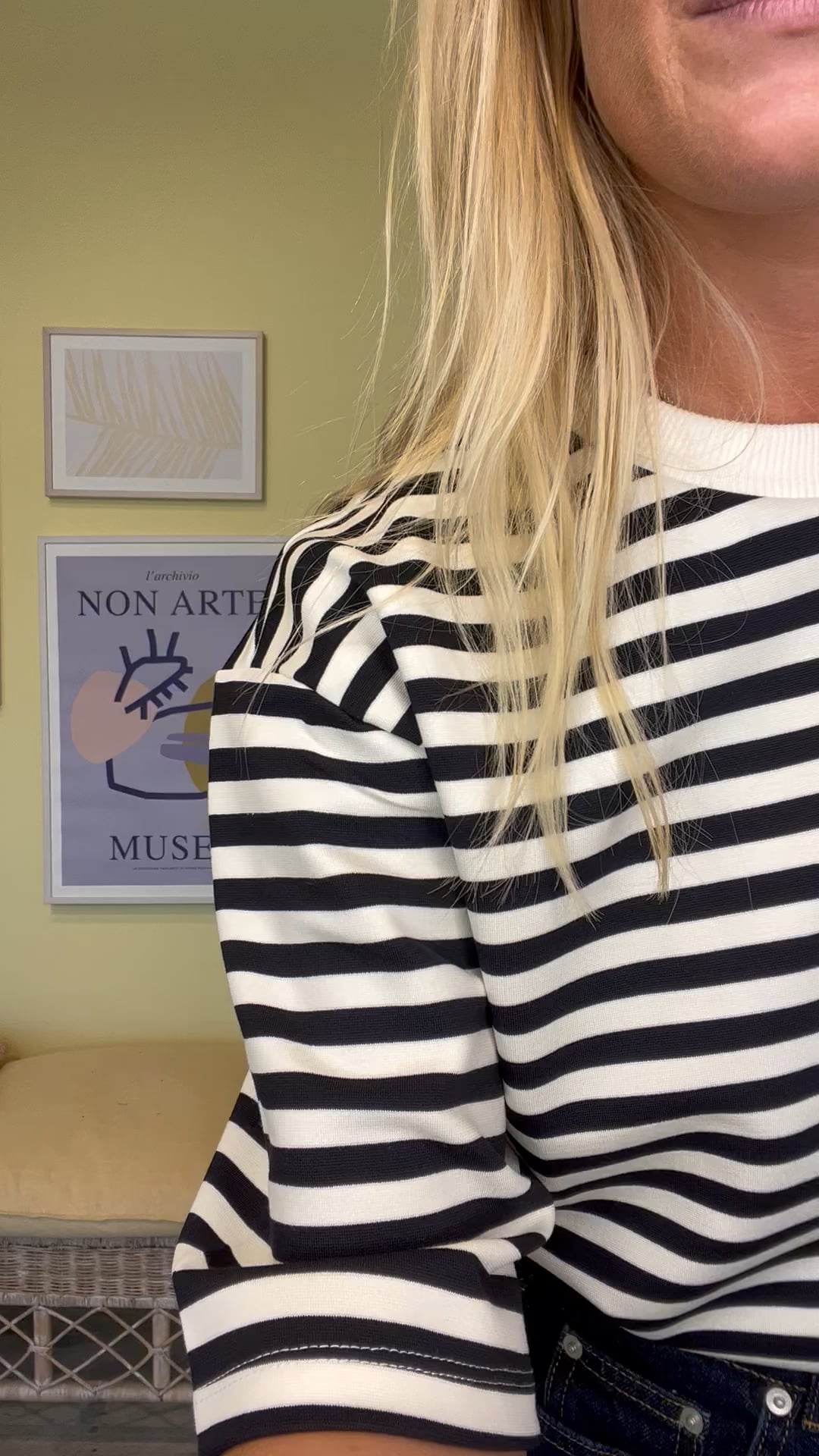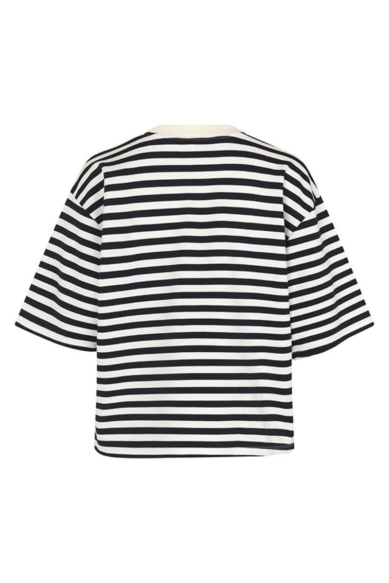 Den fineste T-shirt fra MbyM. T-shirten er i en stribede nuance i blå/råhvid. Den har en rummelig pasform med længere t-shirt ærmer og rund halsudskæring. Den har en fin ribbede hals, som giver den en ekstra detalje. Style den seje t-shirt til dine nederdele for et feminint look eller til et par rå jeans.