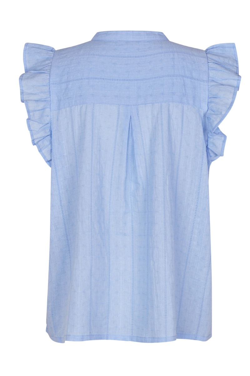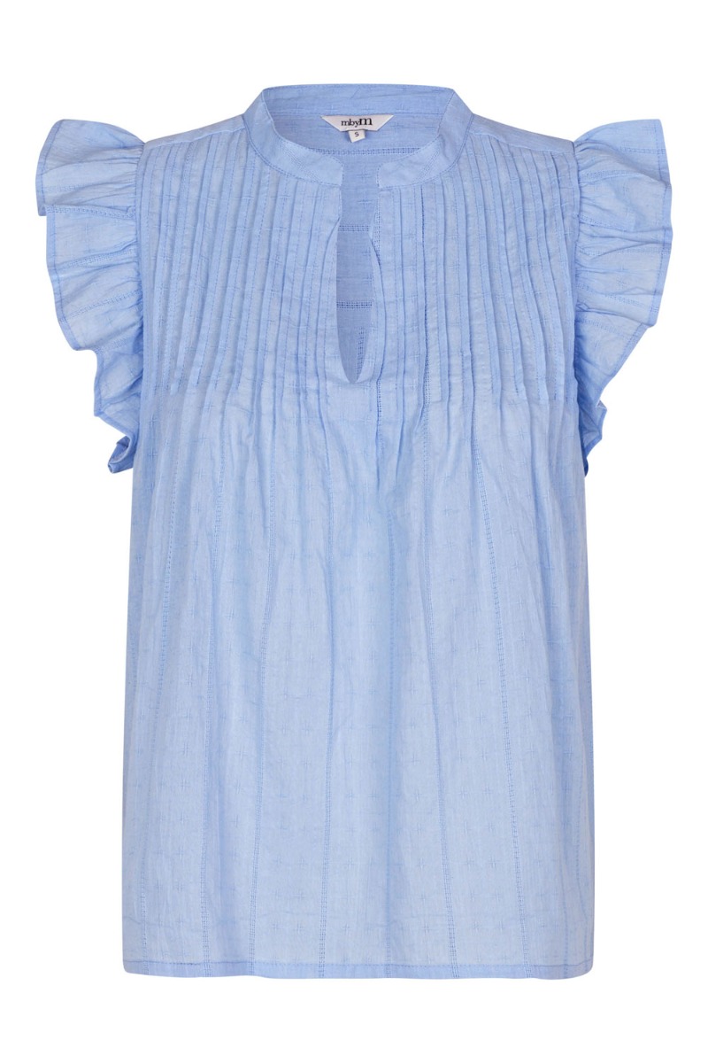 En smuk hverdags top fra mbyM er kommet i en sød lyseblå farve. Den er med flæser ved ærmegabet og har V udskæring foran. Deruodver er den løs i pasformen og passer fint sammen med et par shorts eller jeans.