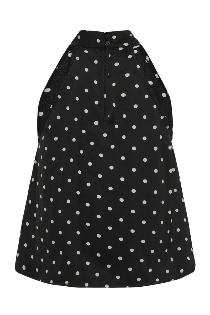En smuk top fra mbyM er kommet i denne sorte farve med hvid prikker. Den er med halterneck snit og har et løst og bredt fald i bunden. Den lukkes med to knapper i nakken. Der kommer et par matchende bukser, men kan sagtens passe til din favorit underdel.