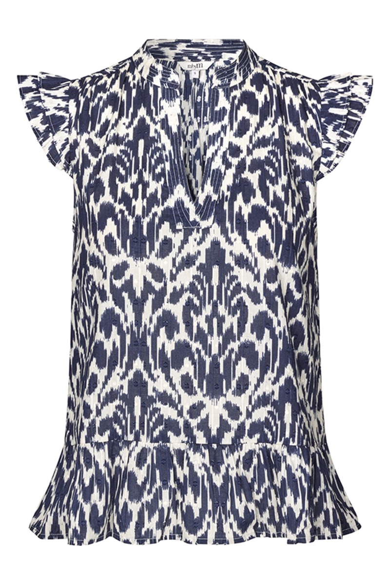 En fin bluse fra mbyM er kommet i en print i navy og hvid. Den er med flæserkanter i bunden og ved ærmerne. Den er også løs pasformen og kan nemt bruges til hverdag til et par shorts eller en buks.
