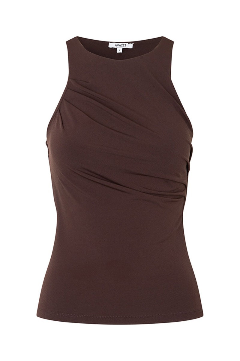 Super lækker top fra mbyM i en smuk chokoladebrun nuance. Toppen har et tætsiddende snit med rund halsudskæring og rynkeeffekter i siden. Den er lavet i en utrolig strækbaer kvalitet og er som smør på kroppen.