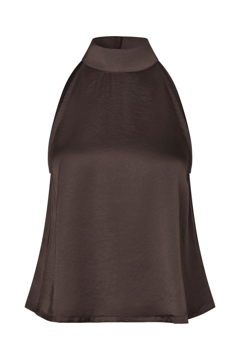 Elegant og stilren top i en dyb brun nuance med en smuk, let skinnende overflade, der giver et eksklusivt og sofistikeret udtryk. Toppen er designet med en høj halterneck-udskæring, som fremhæver skuldrene og giver et moderne og feminint look. Den løse pasform og det lette materiale sikrer et flot fald og en behagelig fornemmelse mod huden. Det enkle design gør toppen alsidig og nem at style til både hverdag og festlige anledninger. Den kan bæres med alt fra elegante bukser og nederdele til jeans for et mere afslappet, men stadig stilfuldt outfit. Kombinationen af den smukke glans og det minimalistiske snit giver et tidløst og elegant udtryk.