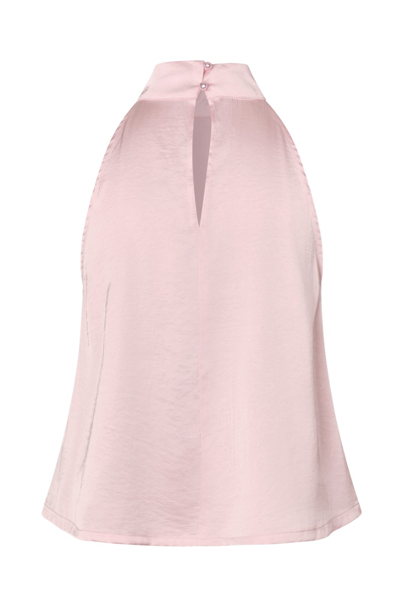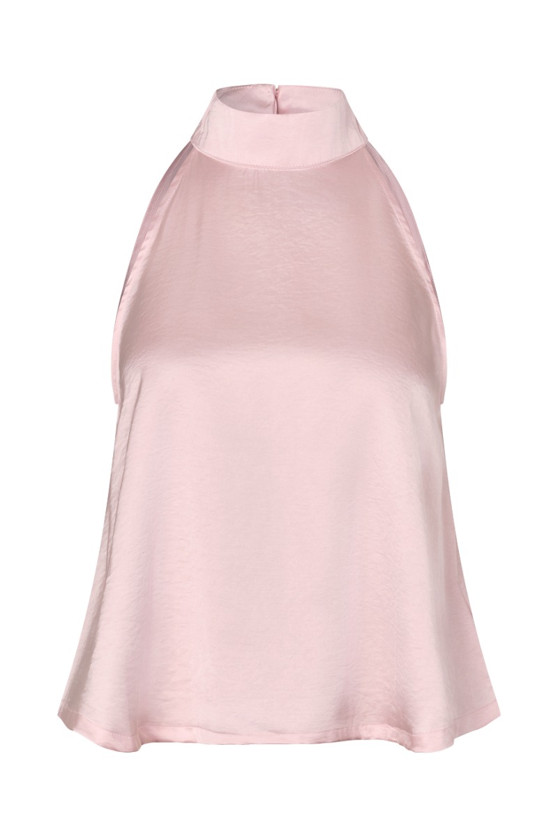 Elegant og feminin top i en smuk lyserød nuance med en let skinnende overflade, der giver et eksklusivt og sofistikeret udtryk. Toppen er designet med en høj halterneck-udskæring, som fremhæver skuldrene og skaber et moderne og stilfuldt look. Den løse pasform og det lette materiale giver et flot fald og sikrer en behagelig fornemmelse mod huden. Det enkle og elegante design gør toppen alsidig og velegnet til både hverdag og festlige anledninger. Den kan styles med alt fra elegante bukser og nederdele til jeans for et mere afslappet, men stadig feminint outfit. Den bløde farve kombineret med den fine glans giver et tidløst og romantisk udtryk.
