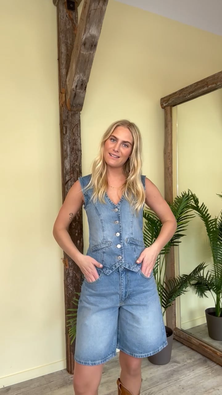 En sej vest fra mbyM i en lækker denim kvalitet er kommet. Den er tætsiddende og i en kraftig kvalitet. Den er fin til at have over en skjorte eller t-shirt, men kan også sagtens bruges uden noget under. Der er et par matchende shorts til.