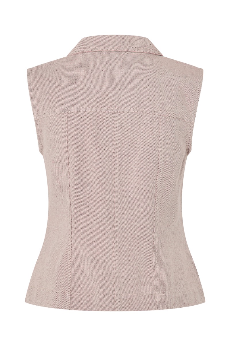 Kortærmet denimvest i en feminin, figursyet pasform, der giver et moderne og stilrent udtryk. Modellen er designet med klassisk krave, gennemgående knaplukning og brystlommer med klap, som tilfører et cool, inspireret workwear-look. Den bløde rosa nuance gør vesten let at style både over kjoler, skjorter eller strik for et lag-på-lag outfit med kant.