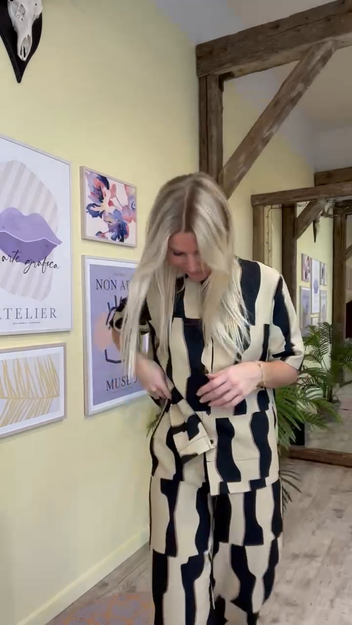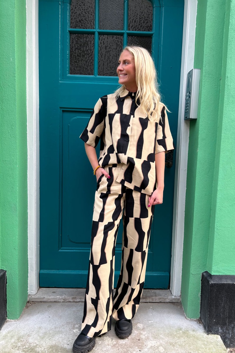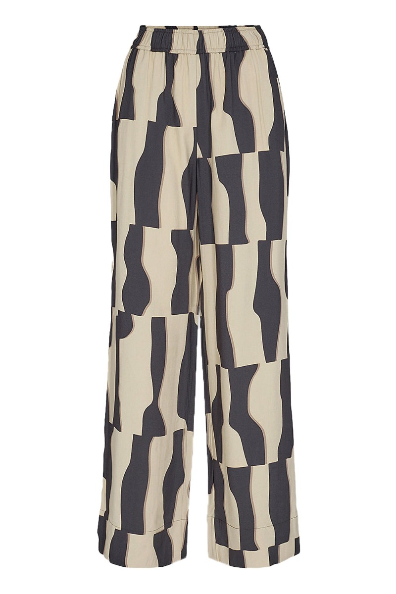Skønne bukser fra Minimum i en løs pasform med bredere ben og mellemhøj talje. Bukserne er designet med et grafisk abstrakt print i brune farver og har en bred elastikkant i livet der gør dem super behagelige at have på. Style bukserne med matchende skjorte i samme print.