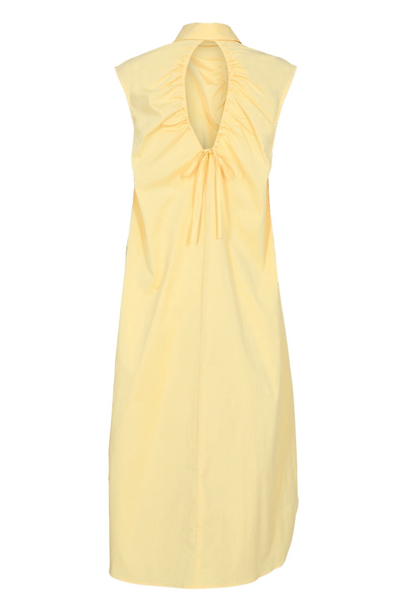 Sødeste kjole fra Minimum med hul detalje bagtil. Kjolen er lang i en rummelig pasform med knapper foran og uden ærmer. Den er super cool at style med en bluse under eller jeans og kan samtidig bruges helt enkelt som den er alene.