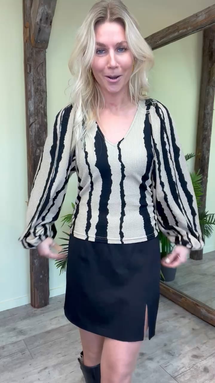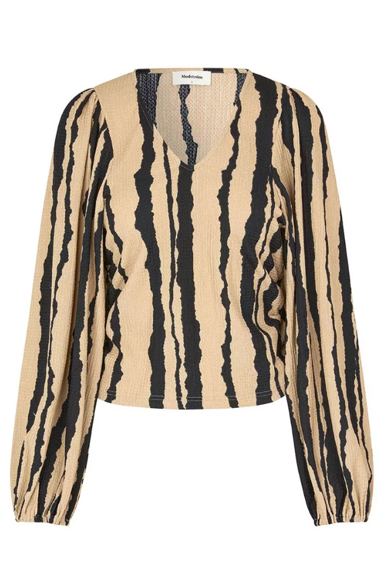 Det fineste bluse er kommet fra Modström i en smuk brun farve med sorte striber. Den er løs i pasformen og har lange ærmer med balloneffekt. Derudover er den V halsudskæring og der findes også et par matchende bukser. Blusen kan dog sagtens bruge til et par andre bukser eller en nederdel.