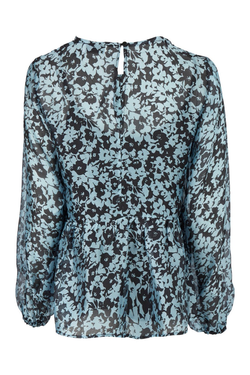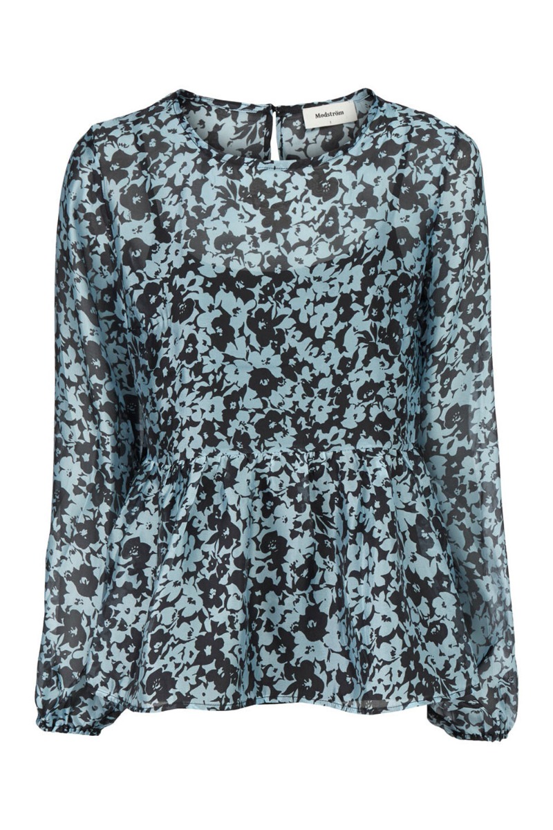 Sød bluse fra Modström i det smukkeste blå blomsterprint. Blusen lukkes i nakken ved den runde halsudskæring, der giver en sød lille åbning bagtil. Den har skæring ved livet der giver en lille peplum i bunden og lange ærmer med elastikkant ved håndleddet, der giver et feminint look. Style den til et par bukser.