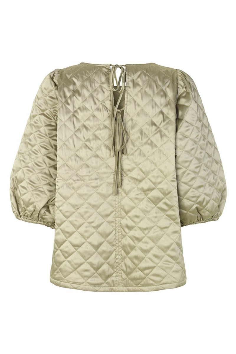 Den sødeste quiltede bluse med korte ærmer fra Modström er netop landet! Denne skønhed er så lækker at have på med en løs pasform og de store ballonærmer. Blusen lukkes i nakken med et sødt lille bånd.