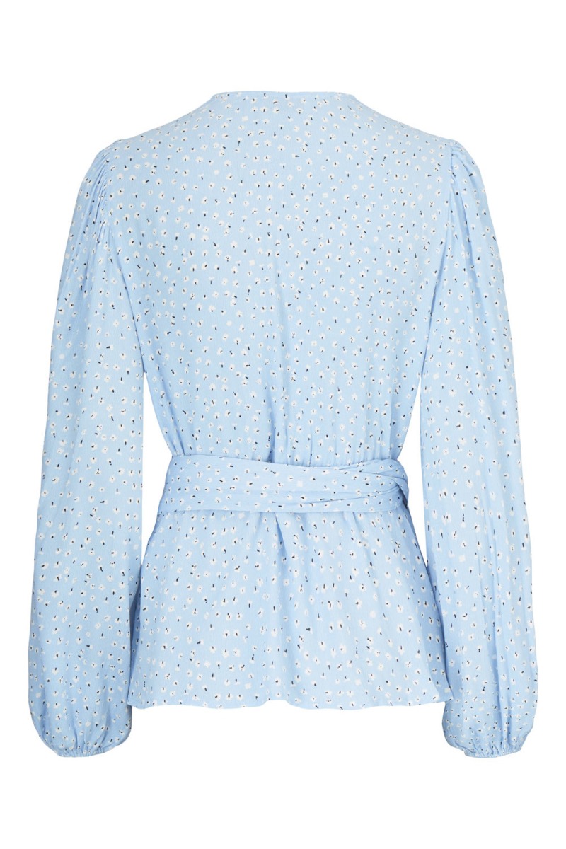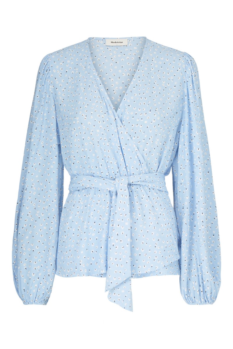 Skøn slå-om bluse fra Modström i et bæredygtigt materiale. Blusen er med slå-om der bindes i taljen og giver en sød peplum i bunden. Ærmerne er lange med elastik ved håndleddet der giver et løst ballon-snit. Toppen har en feminin v-udskæring og elastik i livet. Bundfarven er blå med det sødeste lille hvide blomsterprint og er super fint at style med shorts eller bukser.