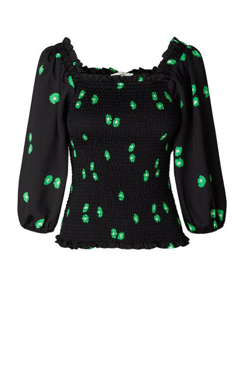 En smuk feminin bluse med sort bundfarve og et stort grønt blomsterprint. Blusen har mellemlange pufærmer med elastik i kanten og en firkantet udskæring med smock der gør den meget stretchy og behagelig at have på.